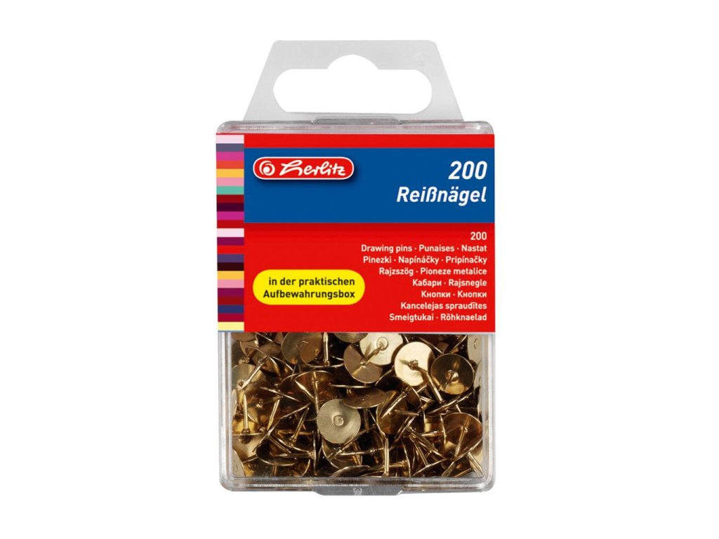 Kovové mosadzné pripínačky. Priemer hlavičky 9 mm. Balené v plastovej krabičke po 200 ks. Farba zlatá.