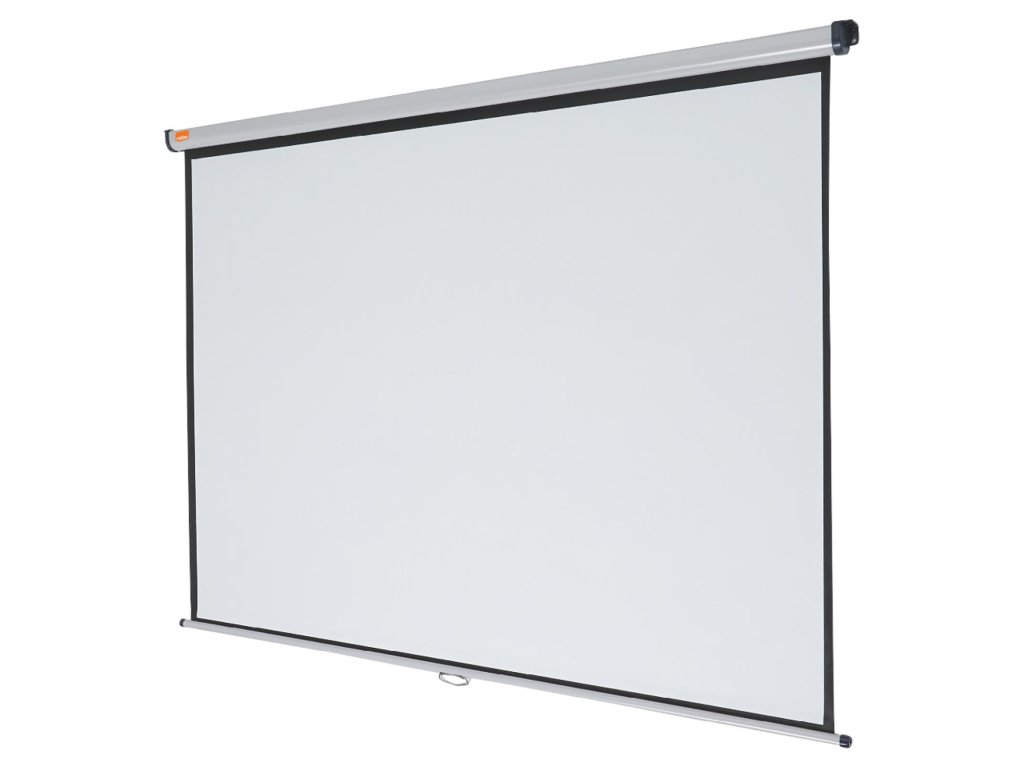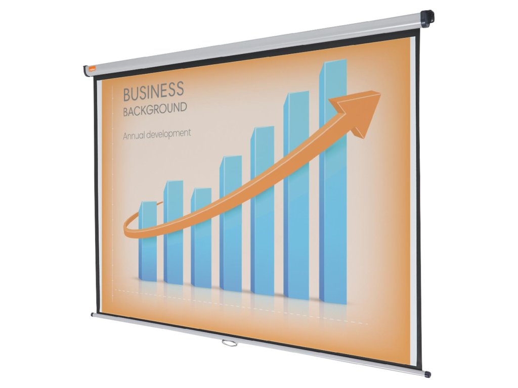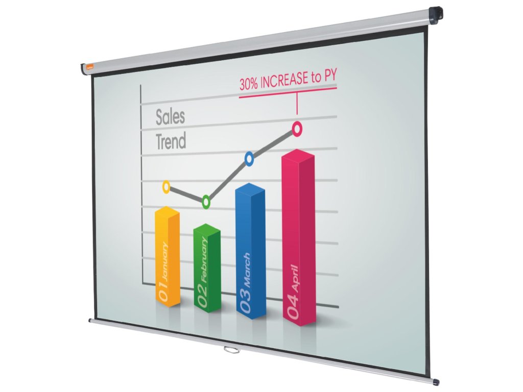 Žiarivý matne biely povrch plátna zaručuje ostrý, podrobný obraz, ktorý zreteľne uvidia všetci diváci. Dá sa ľahko zasunúť do puzdra, aby bolo chránené pred poškodením, alebo uložené, keď nie je používané. Doplnkové držiaky umožňujú inštalovať plátno pred popisovaciu tabuľu alebo ho skloniť smerom k divákom. 2000 × 1513 mm.