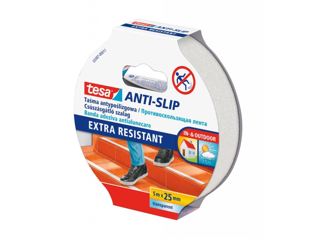 Protišmyková páska tesa® je účinným prostriedkom na prevenciu pádov na kritických miestach, ako sú schodové rohožky, rampy, klzké podlahy alebo paluby. Táto páska nielenže zaisťuje veľmi silnú priľnavosť, je tiež odolná voči UV žiareniu a vode, extrémnym teplotám a čistiacim prostriedkom. Bezpečne sa prilepí k akémukoľvek klzkému povrchu zbavenému nečistôt, oleja a mastnoty. Rozmery 25 mm × 5 m. Farba transparentná.