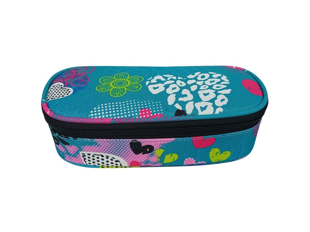 Oválny peračník na zips, 1 vnútorná chlopňa s pútkami na pero, bez náplne, materiál polyester. Rozmery: Š x V x H: 21 x 5,5 x 10,5 cm. Motív Srdce a Kvety.
