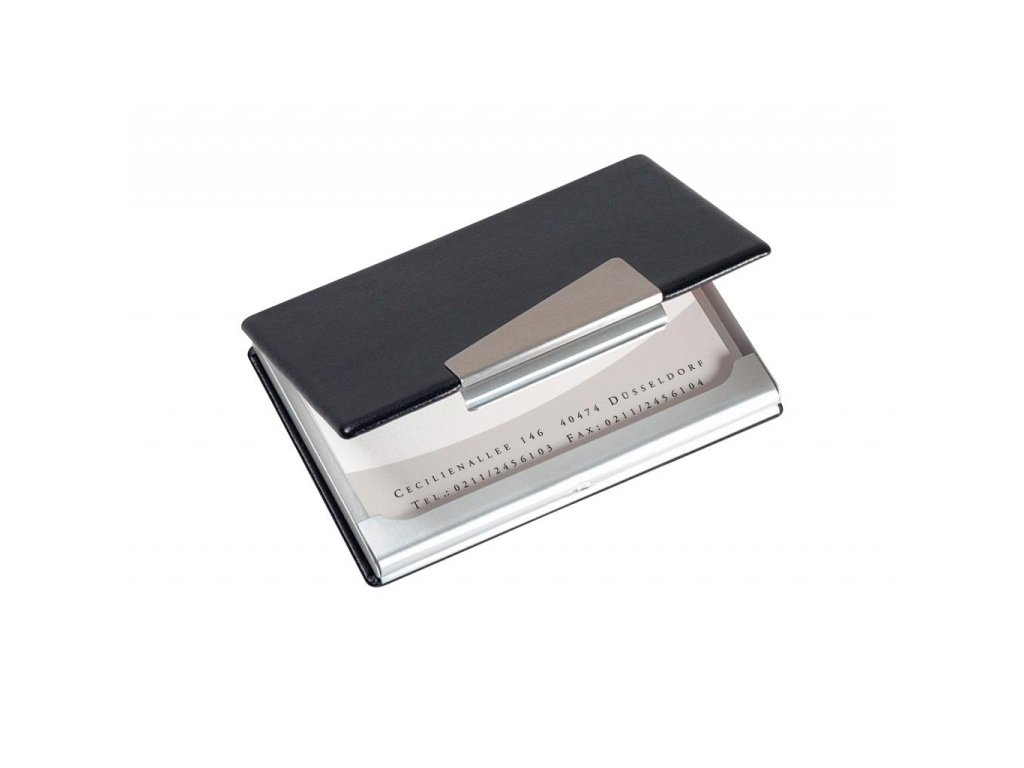 Elegantná krabička na vizitky a magnetické karty, vyrobená z vysokokvalitnej kombinácie hliníka a imitácie kože. Poskytuje bezpečné skladovanie a dokonalú ochranu až pre 20 vizitiek max. rozmerov 90 × 58 mm. Vonkajšie rozmery (š × h × d) 95 × 65 × 12 mm.. Farba čierna. Kapacita 20 vizitiek.