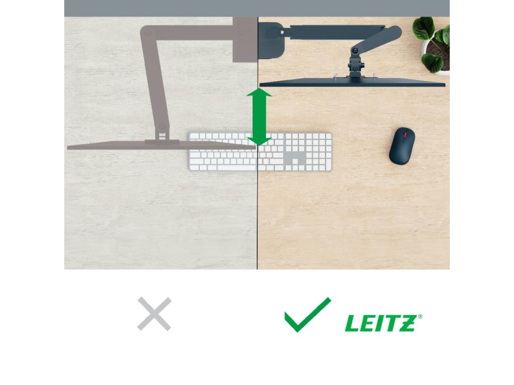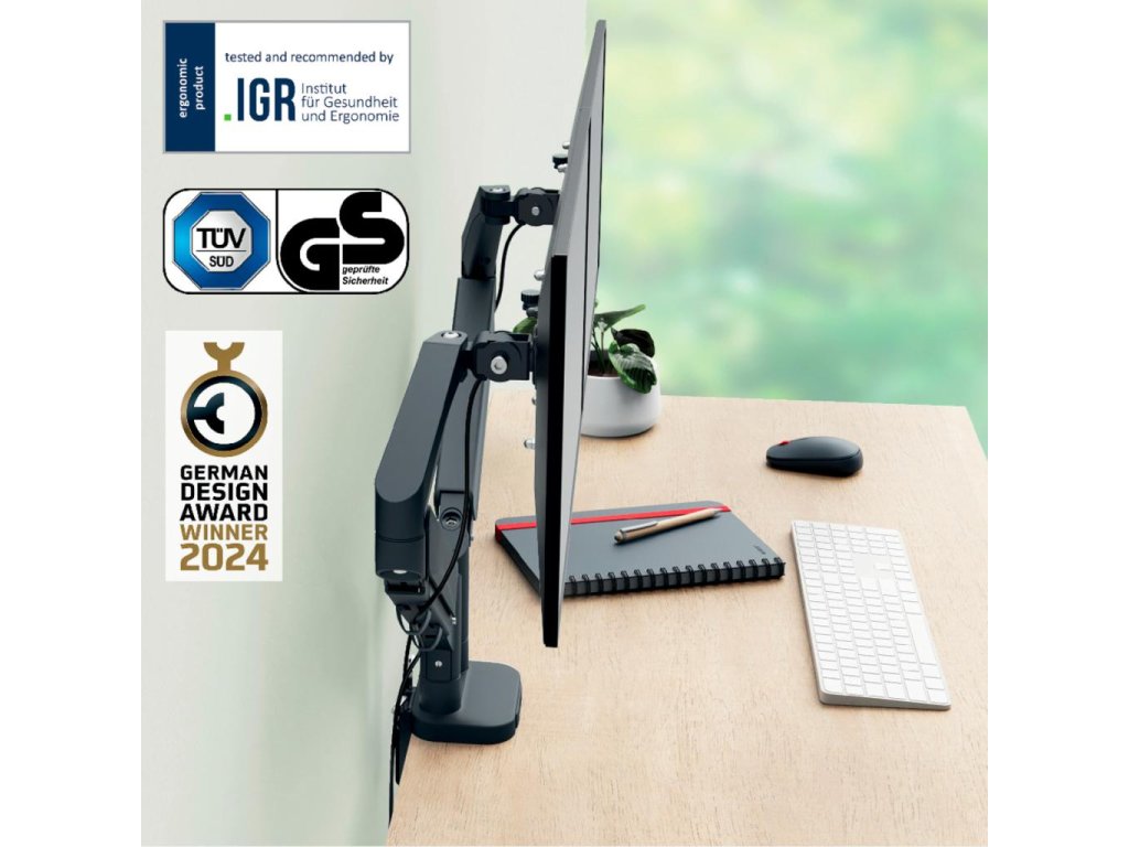 Jednoduchá inštalácia pomocou priloženej odnímateľnej platne Vesa® (75 a 100 mm) a silikónom potiahnutej C-svorky, ktorá znižuje vibrácie a chráni povrch stola, alebo cez otvor pre priechodku (hrúbka dosky stola: 10-80 mm). Vrátane náradia na montáž.