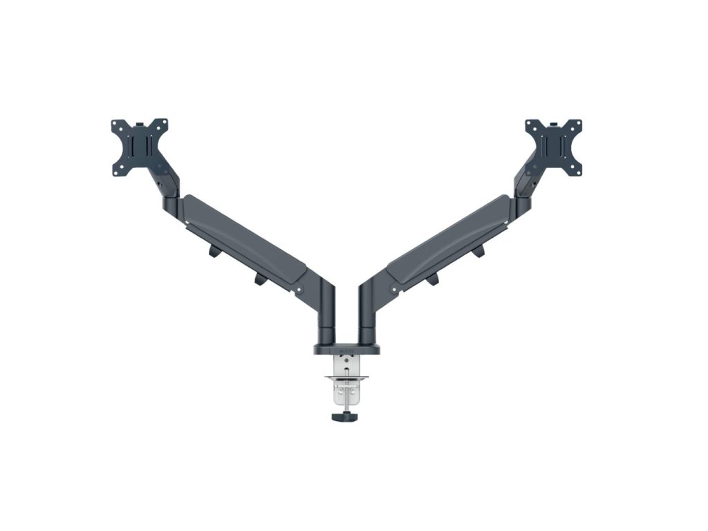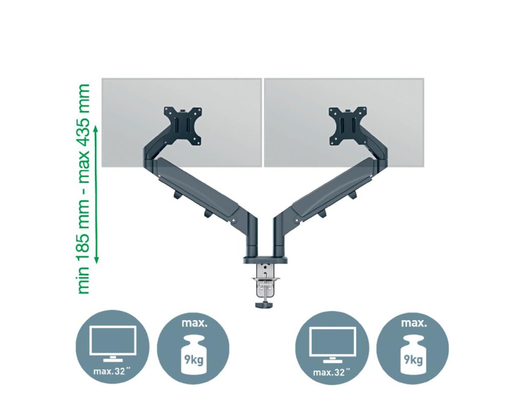 Robustný dizajn podporuje dva ploché alebo zakrivené 17`-32` monitory, každý s hmotnosťou do 9 kg.