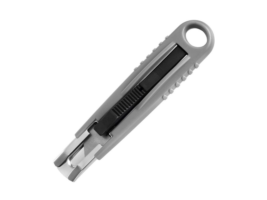 Plastový rezač s automaticky zasúvateľnou čepeľou. Šírka čepele 18 mm. Farba sivá/ čierna.