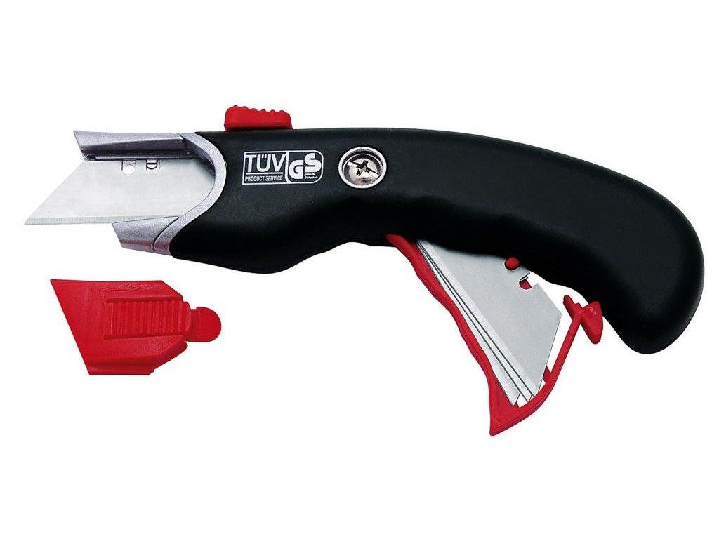 Rezač s pogumovanou rukoväťou a pevnou kovovou hlavicou. Nôž sa vysúva pomocou bežca, ktorý treba počas rezania držať, čo zvyšuje bezpečnosť rezania. Vhodný pre pravákov i ľavákov vďaka umiestneniu bežca v strede rezača. Integrovaný zásobník obsahuje 5 náhradných nožov. Šírka čepele 25 mm. Schválené inštitútom TÜV. Farba čierna/ červená.