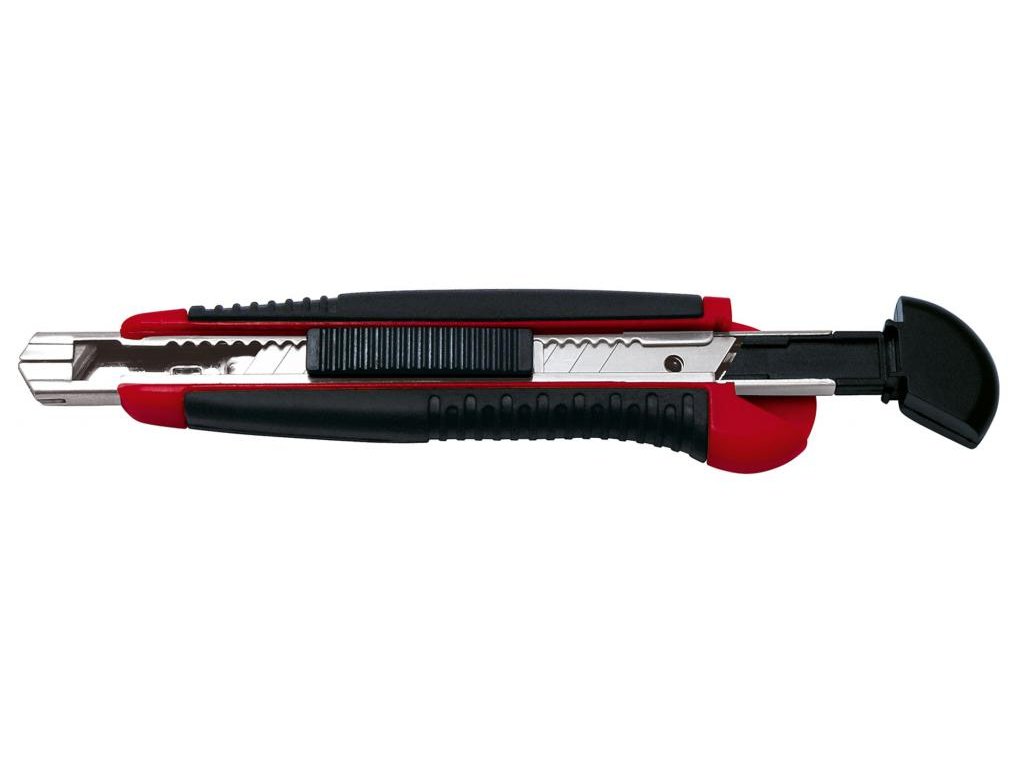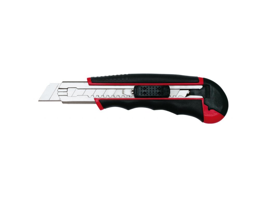 Robustný profesionálny rezač s gumeným vrúbkovaným úchytom, pevným celokovovým vedením noža a automatickým uzamknutím noža. Po vytiahnutí opotrebovaného noža sa zasunutím bežca nainštaluje z integrovaného zásobníka automaticky nôž nový. Šírka čepele 18 mm. V balení 6 náhradných čepiel. Schválené inštitútom TÜV. Farba čierna/ červená.