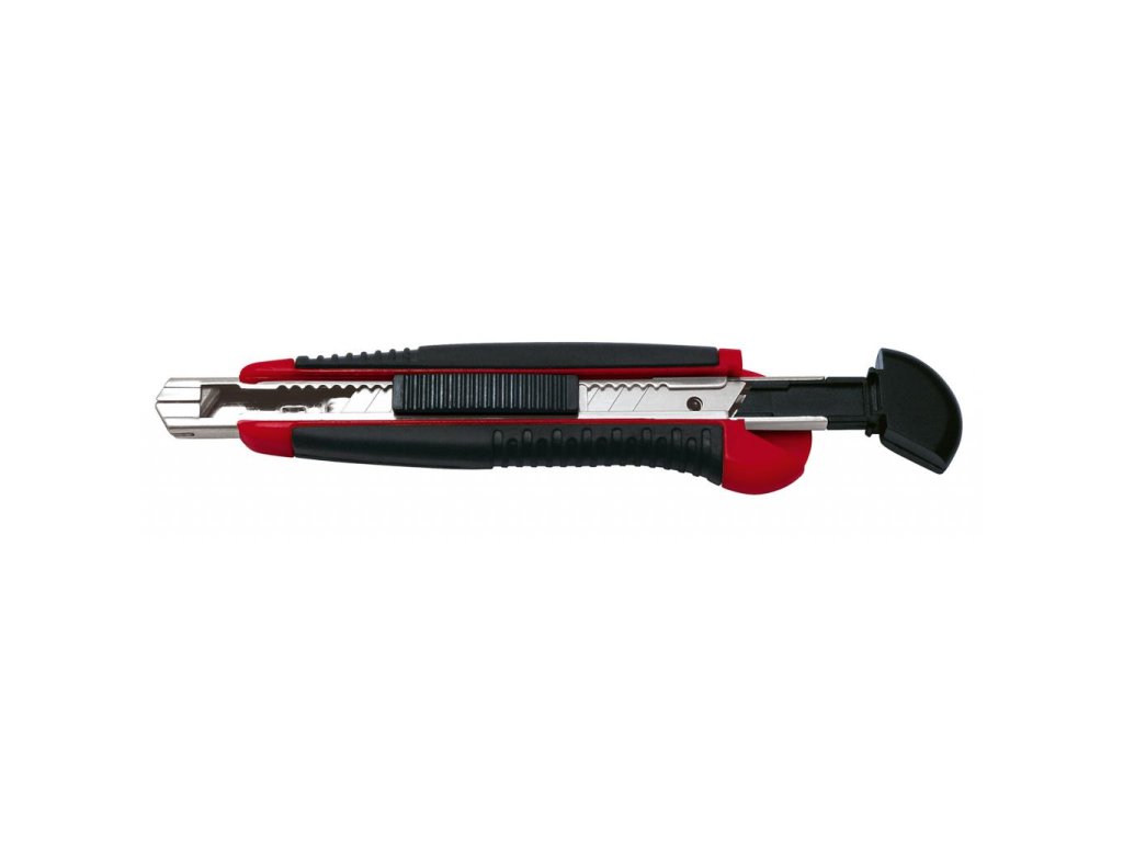 Robustný profesionálny rezač s gumeným vrúbkovaným úchytom, pevným celokovovým vedením noža a automatickým uzamknutím noža. Po vytiahnutí opotrebovaného noža sa zasunutím bežca nainštaluje z integrovaného zásobníka automaticky nôž nový. Šírka čepele 9 mm. V balení 6 náhradných čepiel. Schválené inštitútom TÜV. Farba čierna/červená.