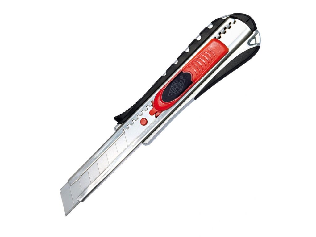 Kovové rezače s gumenou zónou, integrovaným odlamovačom čepele s funkciami štandardného a bezpečnostného rezača. Po ukončení rezu alebo v prípade, keď sa ostrie kĺže po rezanom materiáli, sa čepeľ automaticky zasunie. Čepeľ možno vysúvať aj pomocou integrovaného bežca. Šírka čepele 18 mm. Schválené inštitútom TÜV. Farba červená/ čierna.