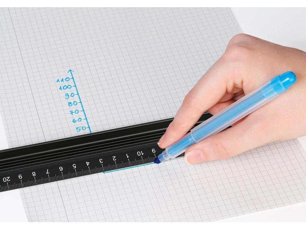 Vysokokvalitné rezacie pravítko z čierneho eloxovaného hliníka pre dlhú životnosť. Ľahko čitateľné centimetre pre maximálnu presnosť pri rezaní. 4 mm vysoká rezná hrana zaisťuje presné rezanie. Vysoký chránič proti prerezaniu (12,5 mm), ktorý účinne zabraňuje poraneniu prstov. Vyvýšený hrebeň zabraňuje rozmazaniu atramentu. Žiadne skĺznutie pri kreslení alebo strihaní vďaka 15 mm širokému protišmykovému pásiku na spodnej strane. Dĺžka 45 cm.