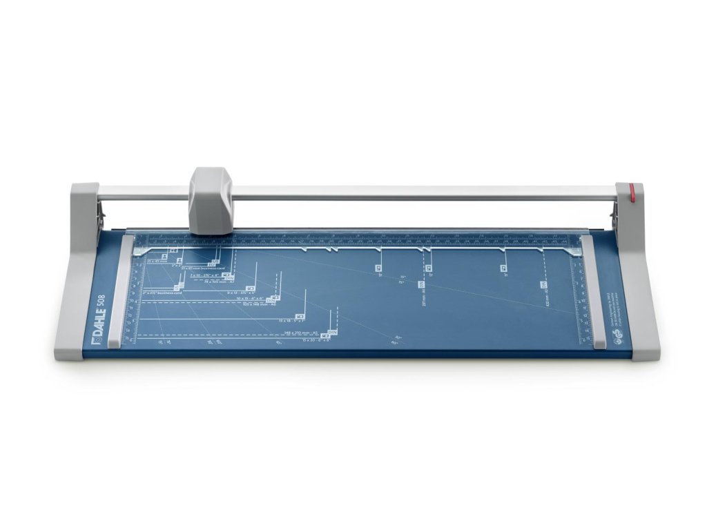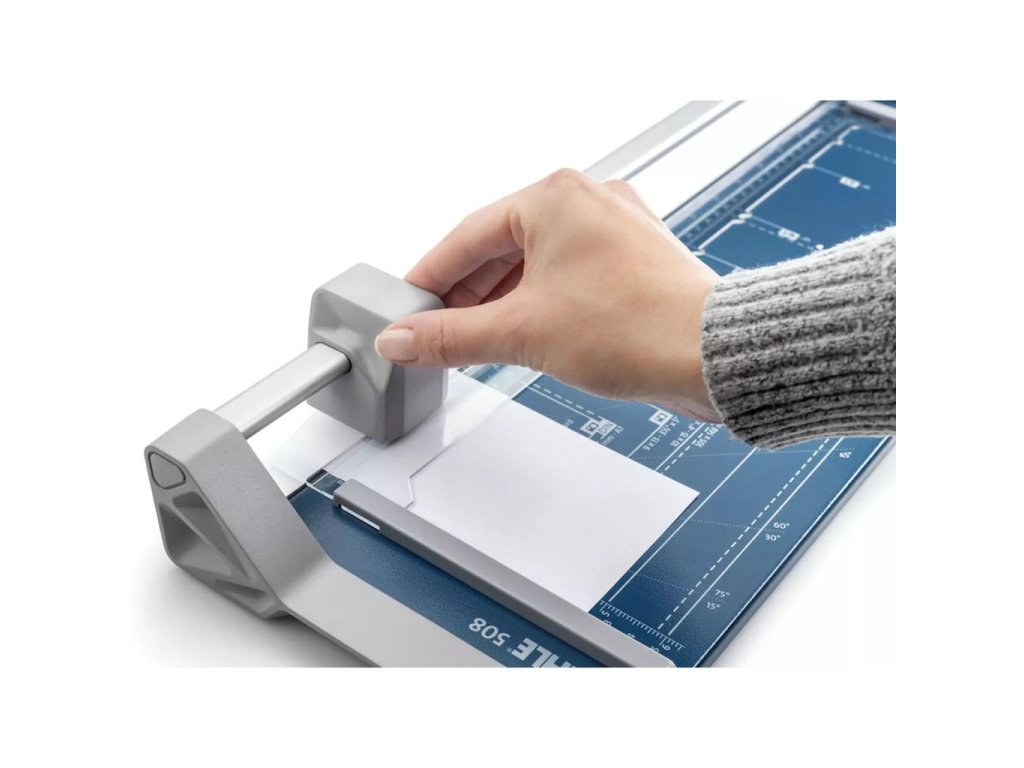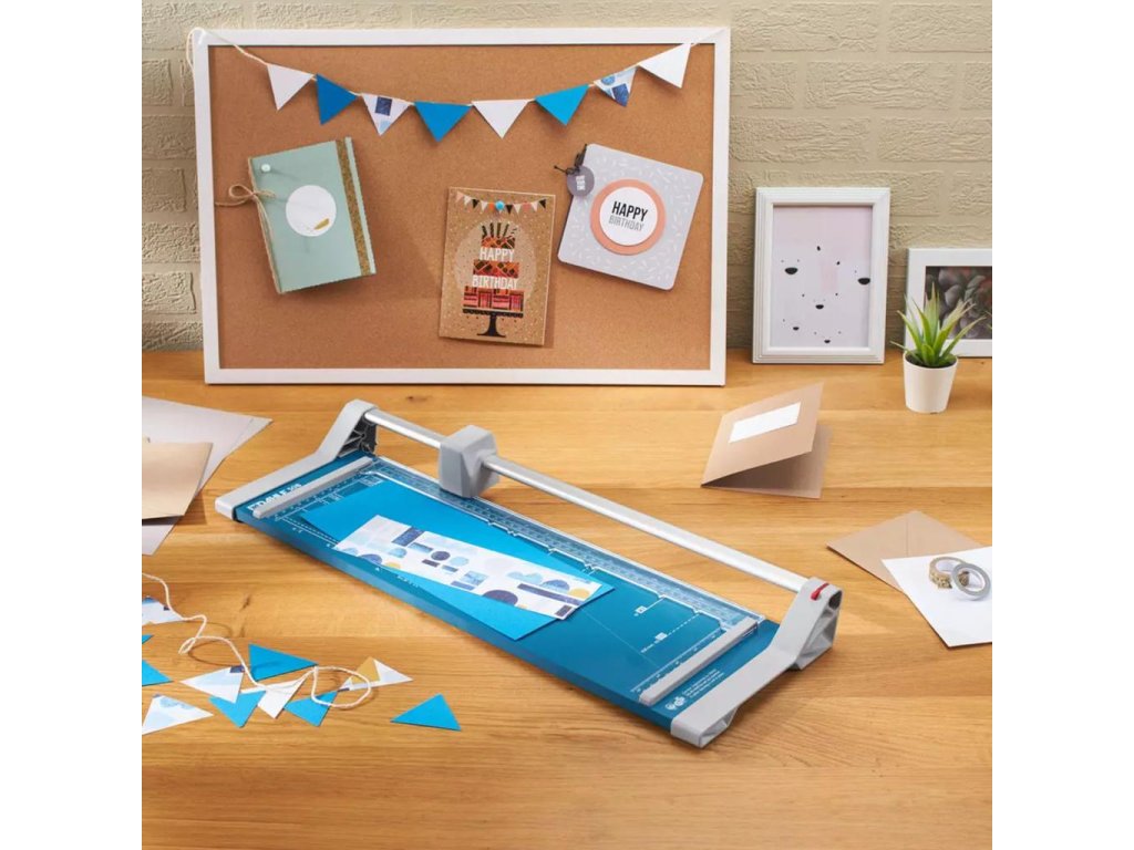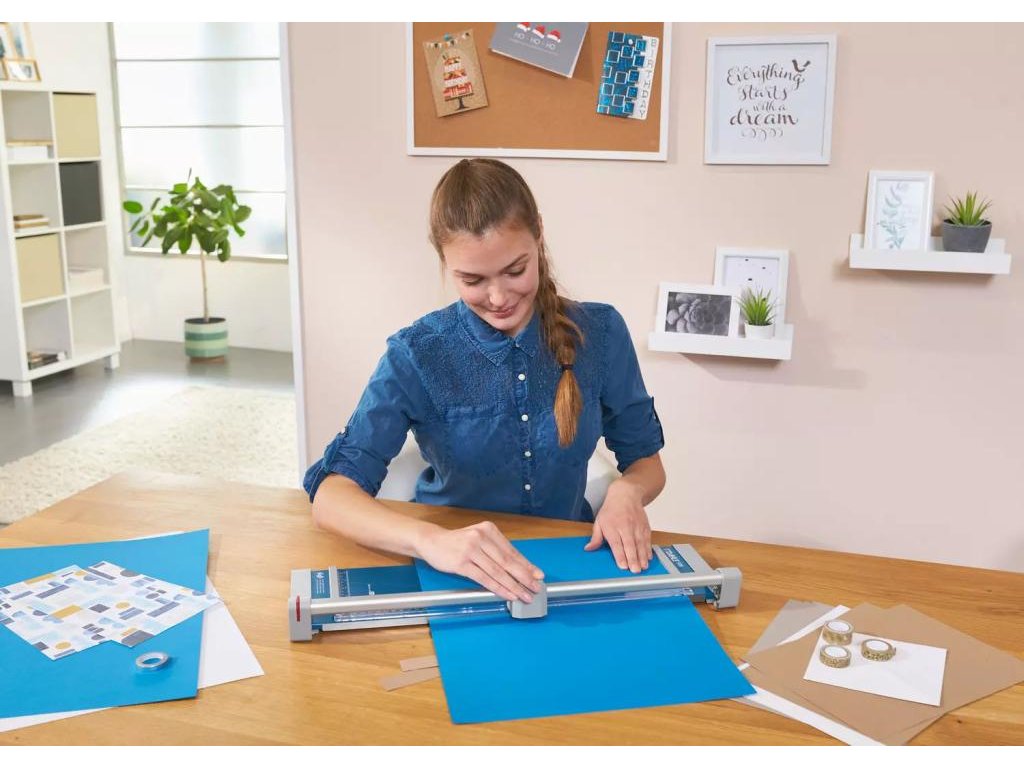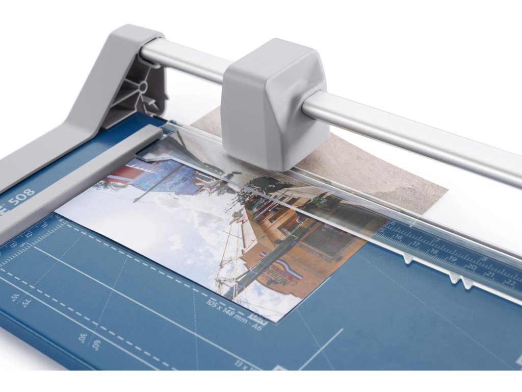 Rezačka s kruhovým nožom a kovovou základňou. Rotačný nôž v plastovom kryte, automatický prítlak, mierky v cm a DIN formátoch. Vhodná na rezanie papiera, etikiet, fotiek a filmov.