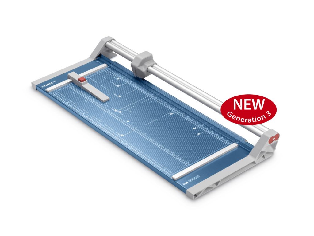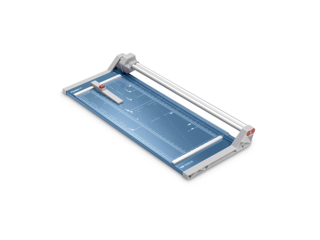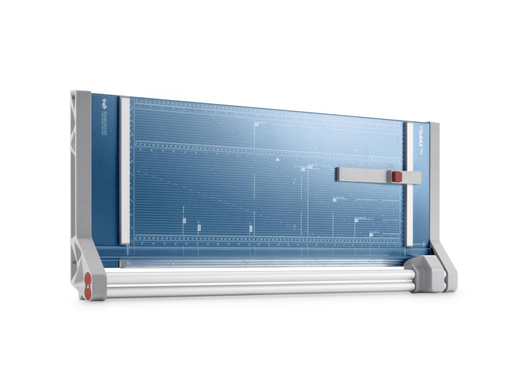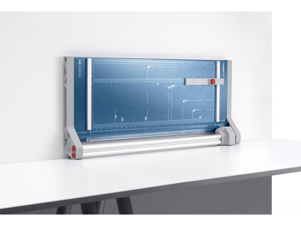 Profesionálna rezačka s kovovou základňou a presným rezom na grafické účely (filmy, fólie, papier). Kruhový nôž umiestnený v plastovom ochrannom kryte sa automaticky brúsi pri rezaní o protinôž - oba nože z tvrdenej ocele. Automatický prítlak pohybom rezacej hlavy, zadný doraz. Mierka v cm/inch. Na pracovnom stole sú vyznačené formáty DIN. Možnosť montáže na stenu.