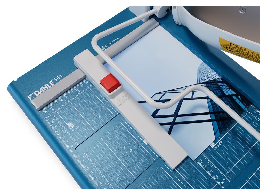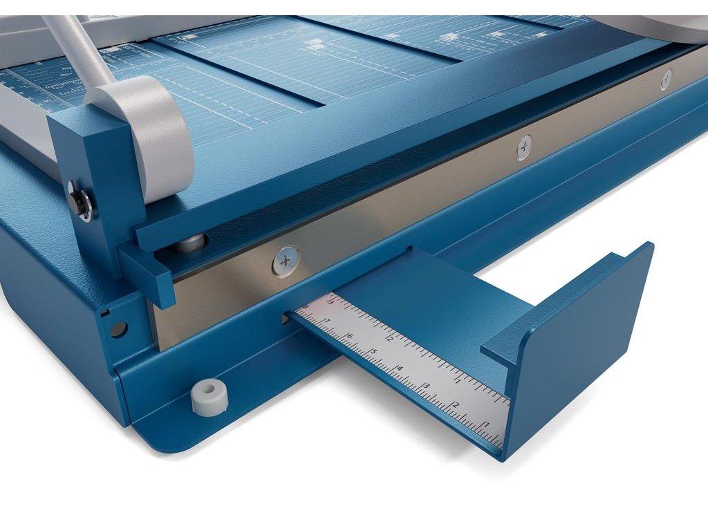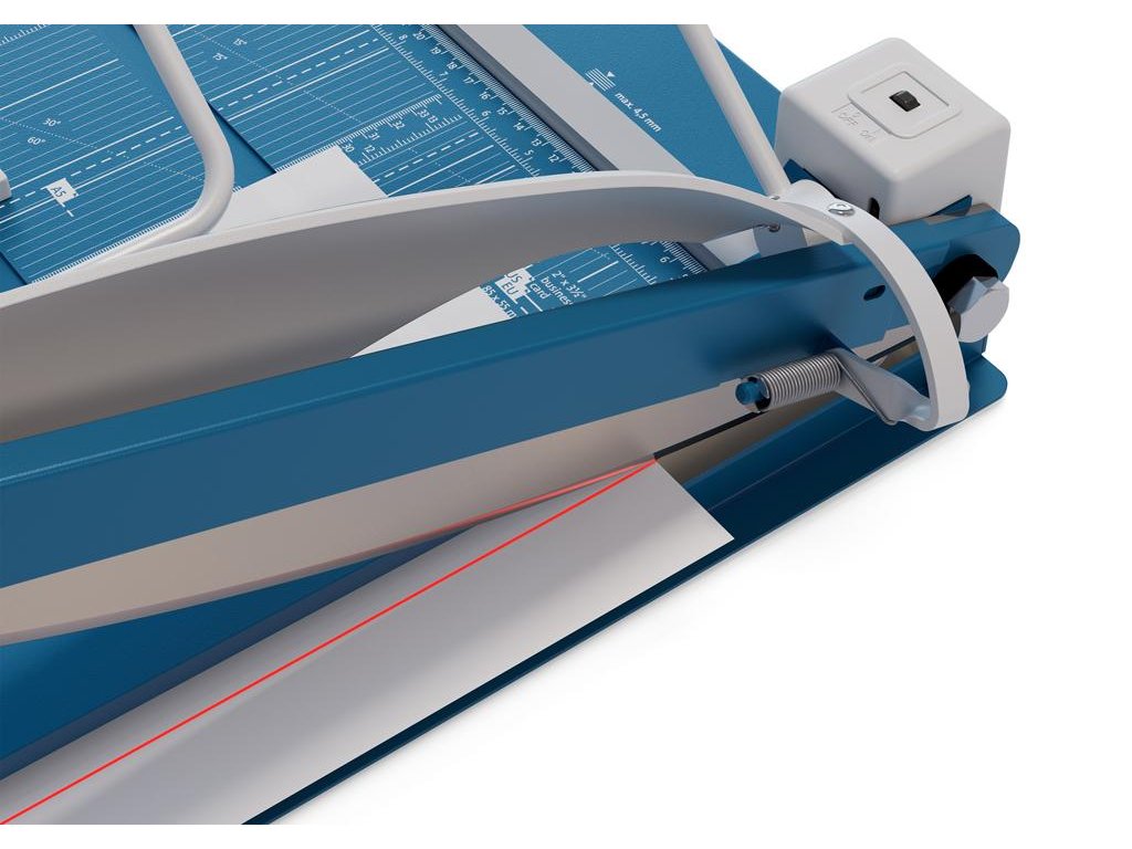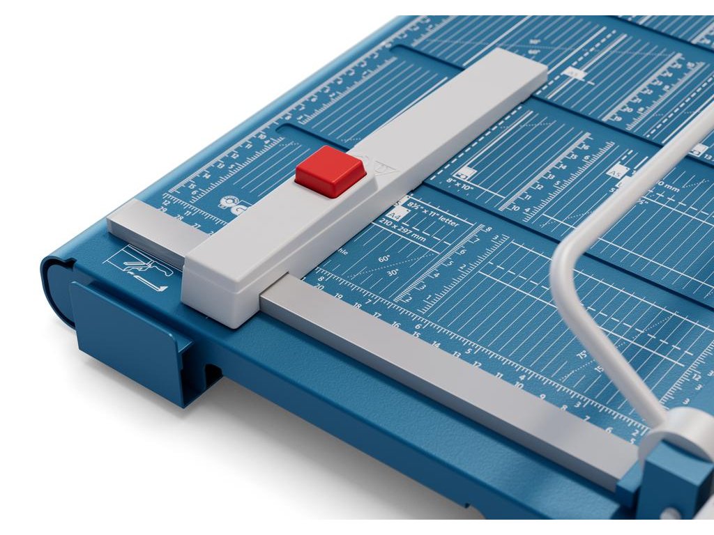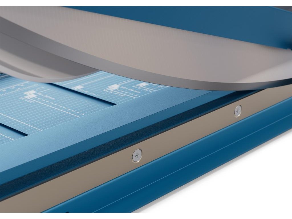 Protišmyková, pohodlná a presná páková rezačka s kovovou základňou na rezanie papiera, kartónu, kože, plastu. Inovovaná technológia s laserovým lúčom, indikujúcim reznú líniu. Brúsený vrchný a spodný nôž z kvalitnej nožiarskej ocele Solingen, rotujúci kryt okolo ostria. Stabilný stôl z masívneho kovu so zaoblenými hranami a protišmykovými gumenými nožičkami pre pevné postavenie. Formátovacie čiary na stole pre lepšie zarovnanie materiálov s praktickou mm stupnicou pozdĺž reznej hrany. Presná mierka v cm/inch a DIN formátoch. Výrez na spodnej časti na pohodlné prenášanie. Presný indikátor laserového lúča pre profesionálne výsledky rezania.