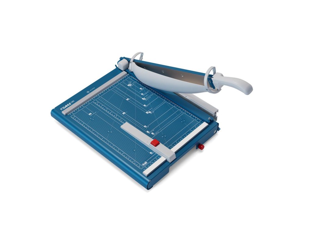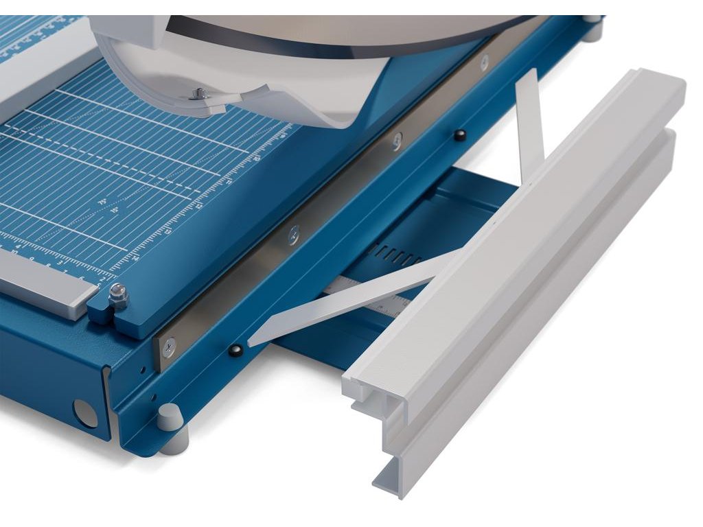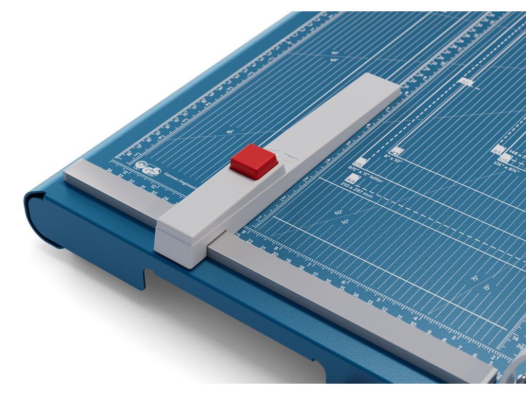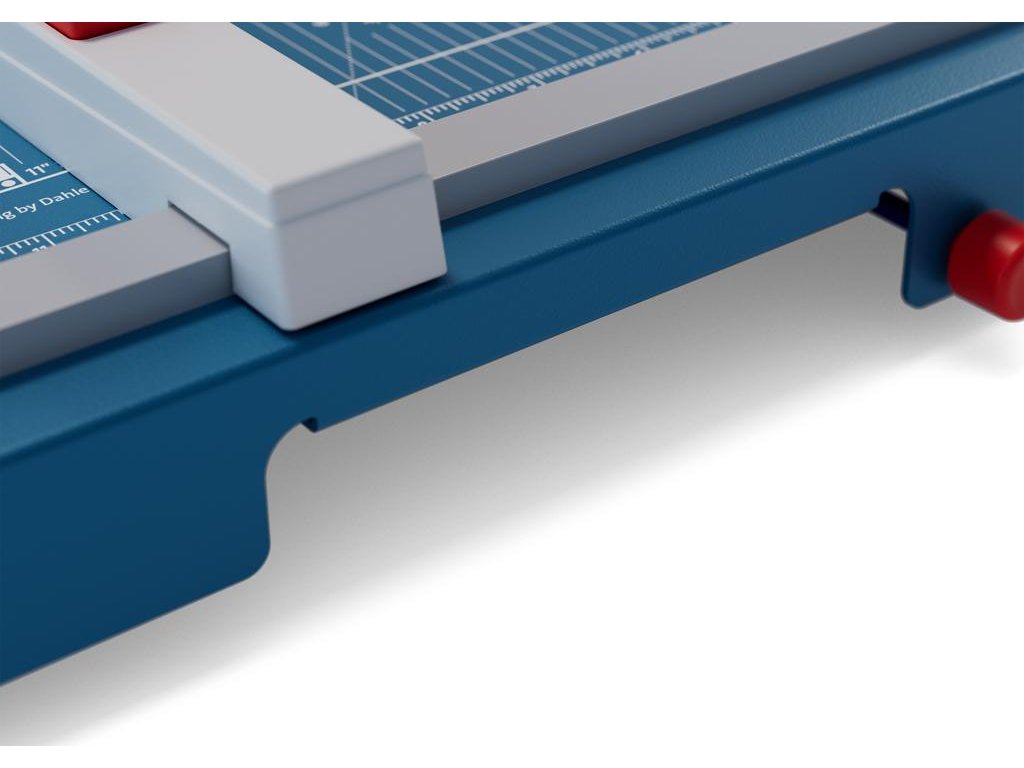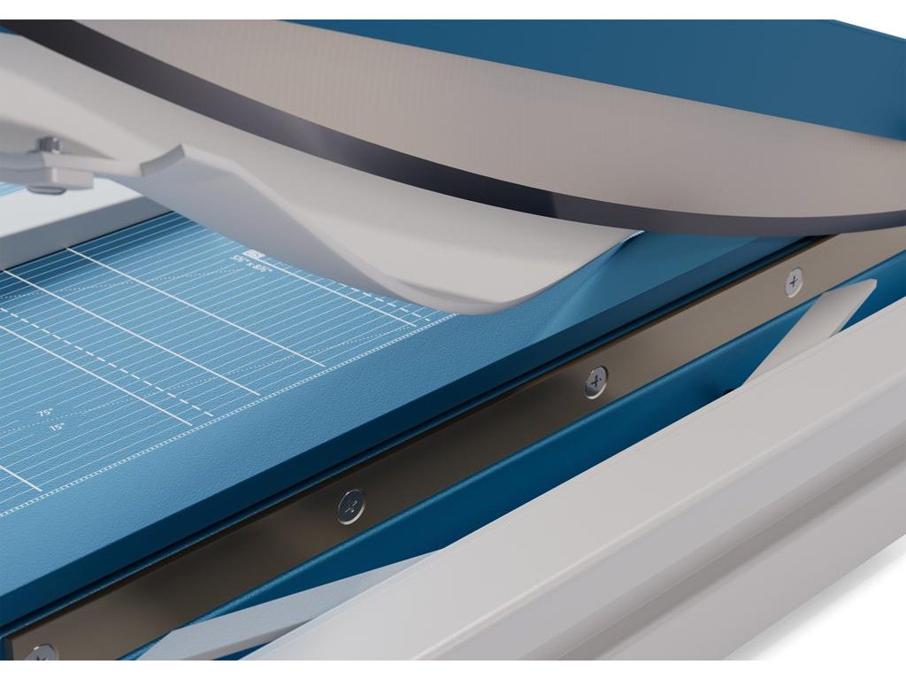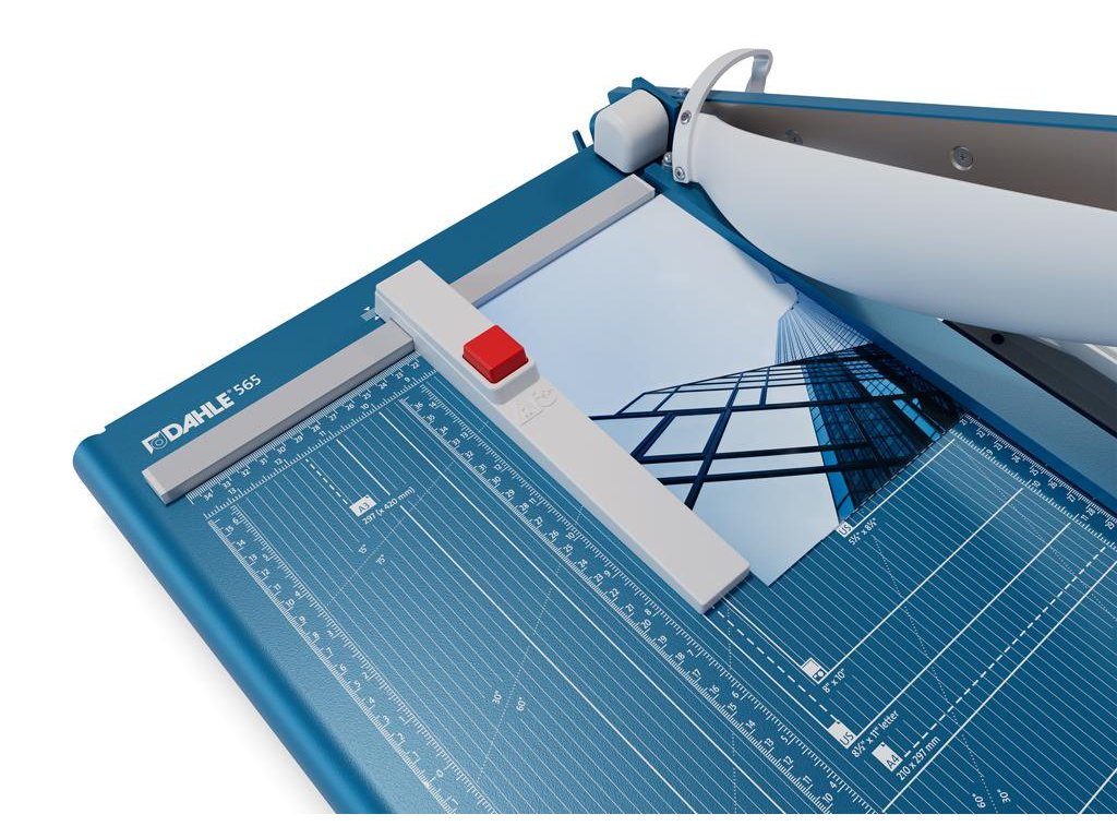 Veľkorozmerná, protišmyková a presná páková rezačka z pevného oceľového plechu. Základný vrchný a základný spodný brúsený nôž vyrobený z kvalitnej nožiarskej ocele Solingen. Rotujúci kryt okolo ostria chráni prsty pred náhodným porezaním. Presná mierka v cm/inch a DIN formátoch. Automatický prítlak. Model s výrezmi na pohodlné prenášanie, navyše vybavený predným dorazom, vysúvateľným do 170/185 mm. Pohodlná práca vďaka ergonomickej rukoväti optimalizovanej pre prenos sily zhora. Unikátny automatický ochranný kryt Dahle pre jasný výhľad na reznú hranu.