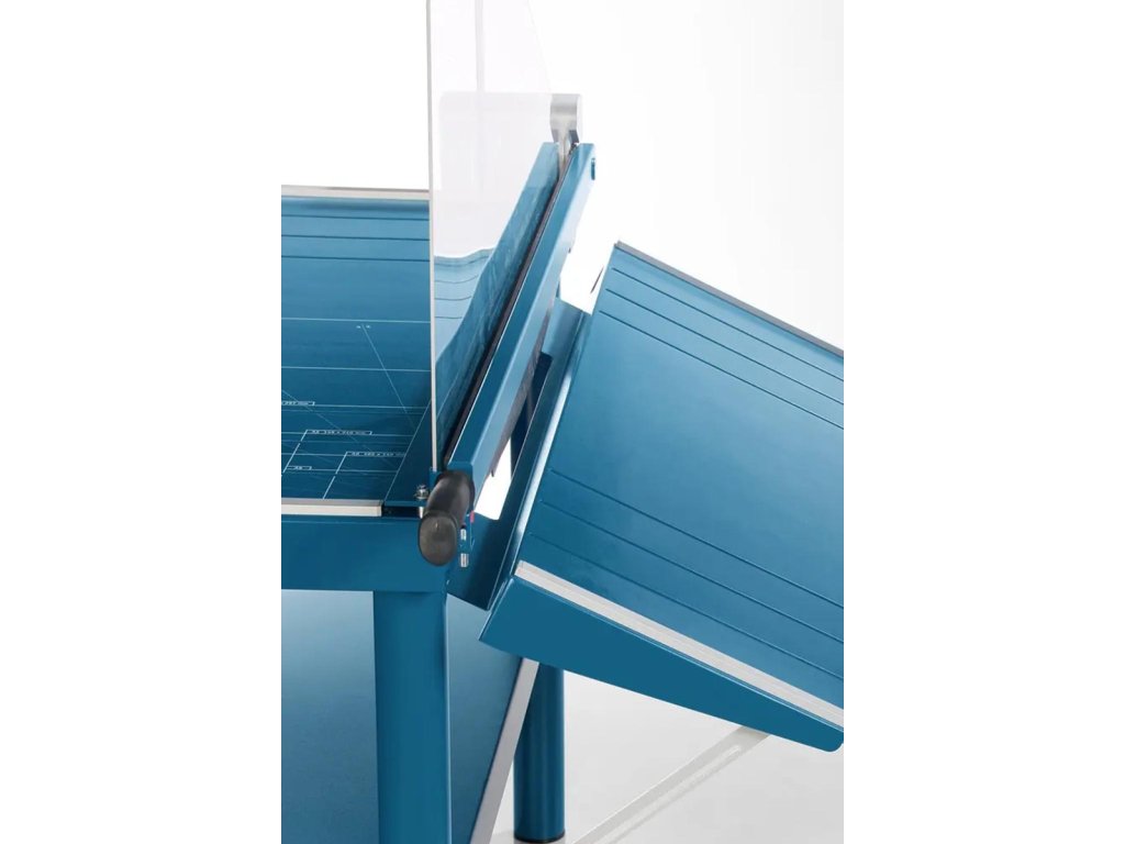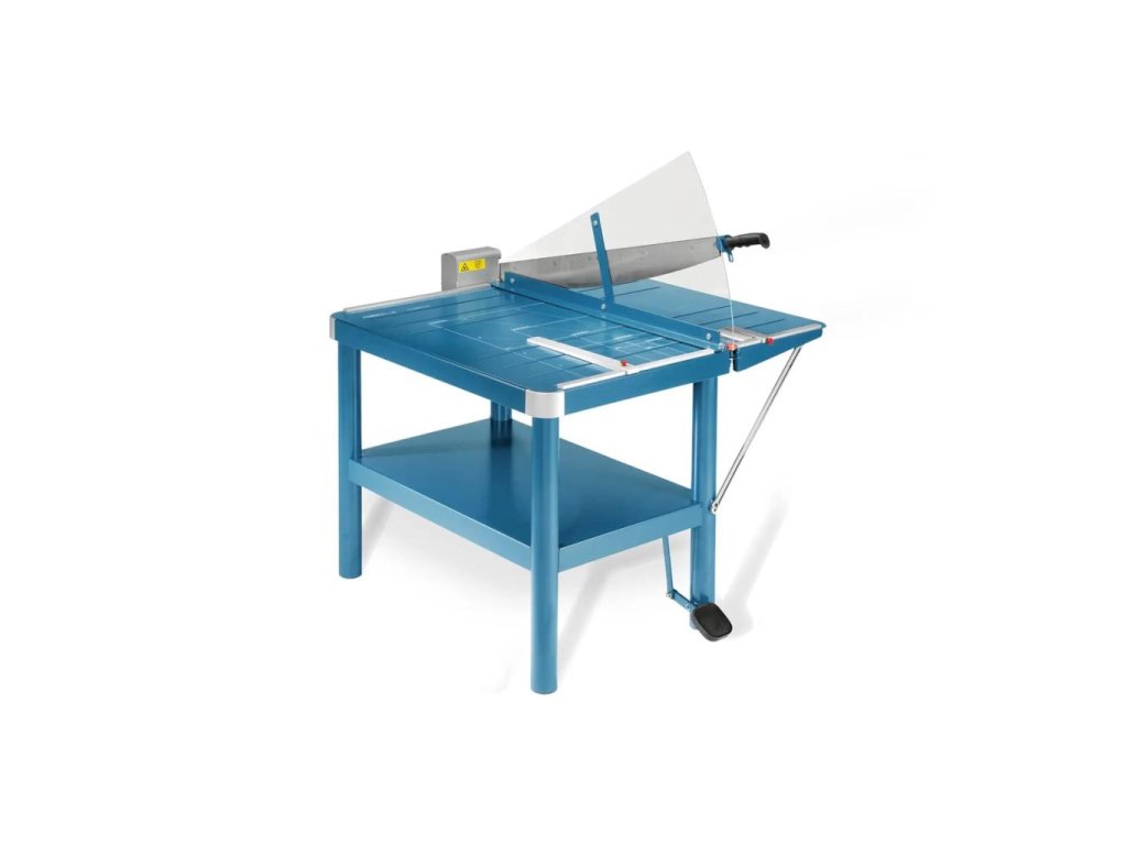 Veľká kovová robustná páková rezačka s vlastným stojanom a uzamykateľným nožom. Brúsený vrchný a spodný nôž z kvalitnej nožiarskej ocele Solingen, rozkladateľný bočný stôl, nožný pedál na zabezpečenie prítlaku rezaného papiera, priehľadný ochranný kryt ostria z plexiskla, 2 bočné dorazy, zadný doraz. Predný doraz, fixovateľný ručnou pákou, vysúvateľný do 275 mm. Mierka v cm/ inch, DIN formáty.K rezačke je možné objednať zariadenie na rezanie tenkých prúžkov a zariadenie umožňujúce vytvoriť laserový lúč, indikujúci reznú líniu.