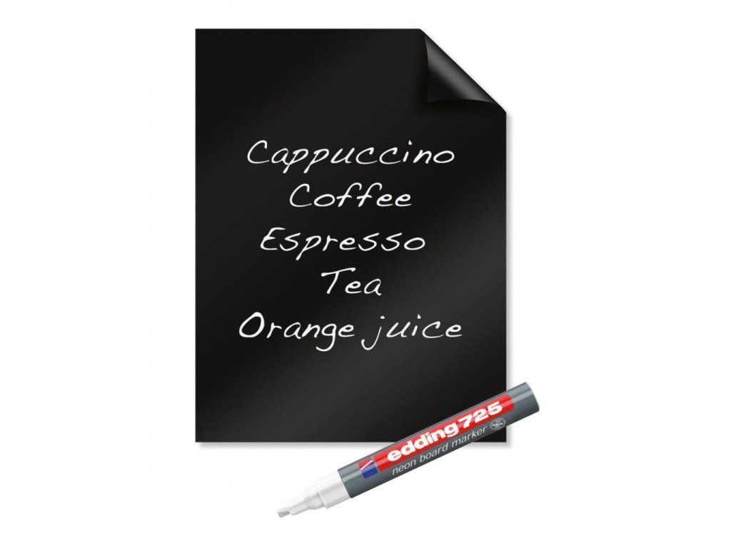 Rolka s vysoko efektívnym elektrostatickým nábojom popisovateľná neónovým popisovačom edding 725, obj. kód ED072549. Tento druh fólie je využiteľný v miestnostiach, kde svetlo sťažuje prezentáciu, na začiernenie, resp. stmavnutie okien, i ako originálny spôsob zviditeľnenia menu v reštaurácii. 25 listov šírky 60 cm s perforáciou po 80 cm. Plne recyklovateľná. Elektrostatický náboj umožní jej priľnutie na rôzne povrchy bez použitia lepidla. Fóliu jednoducho odmotáte, v perforovanom mieste odtrhnete a zľahka pritlačíte na daný povrch. Povrch fólie umožní tiež udržanie papierových poznámok bez ich nalepenia. Väčšie balenie 4 rolky. Rozmery š × v : 60 × 80 cm.