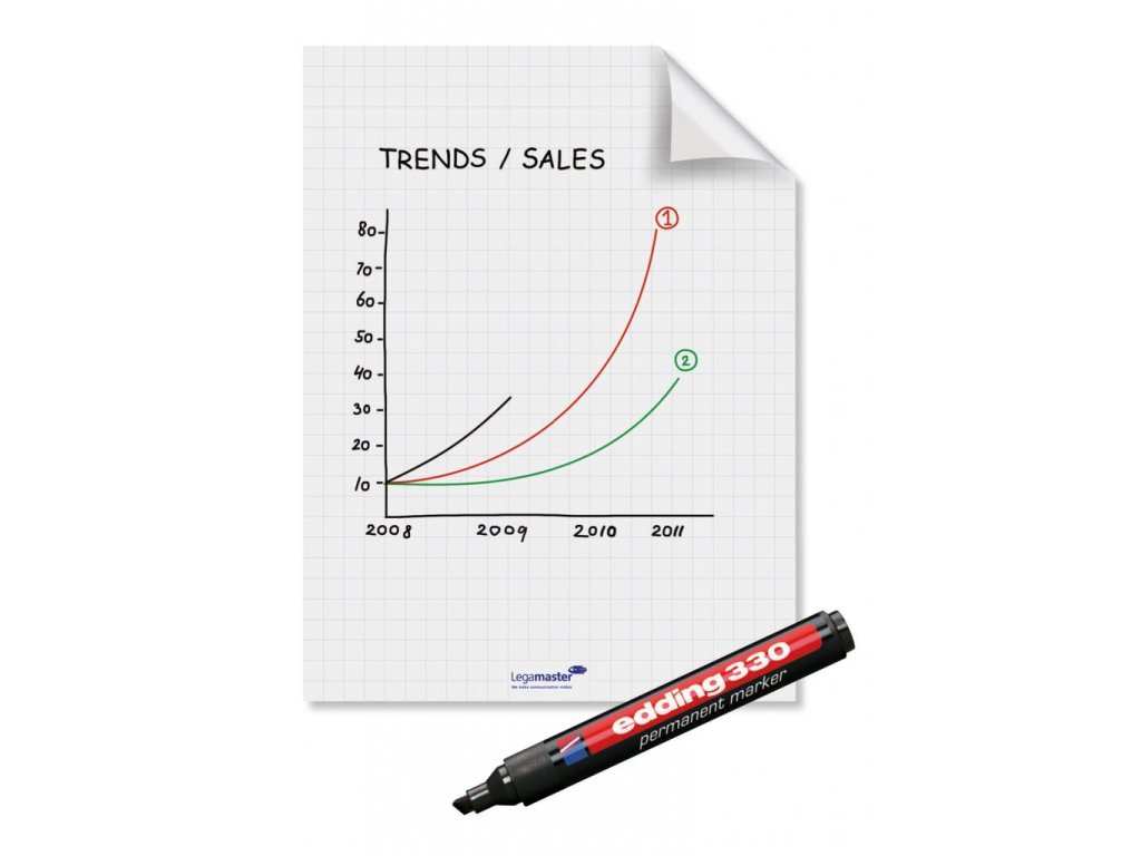 Rolka fólie s 25 štvorčekovanými listami (rozmer štvorčeka 2,5 × 2,5 cm) z bieleho polypropylénu v šírke 60 cm. Perforácia po 80 cm. Popisovanie permanentnými popisovačmi (edding). Elektrostatický náboj umožní priľnutie filmu na rôzne povrchy - sklo, stenu, drevo a tapetu bez použitia lepidla. Fóliu jednoducho odmotáte, v perforovanom mieste odtrhnete a zľahka pritlačíte na daný povrch. Na obale hárku je perforácia na uchytenie balenia na flipchartovú tabuľu. Povrch fólie umožní tiež udržanie papierových poznámok bez ich nalepenia. Väčšie balenie 4 blokov.
