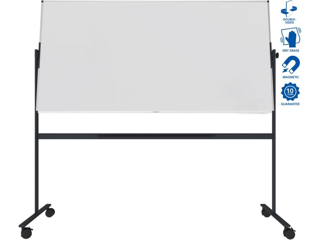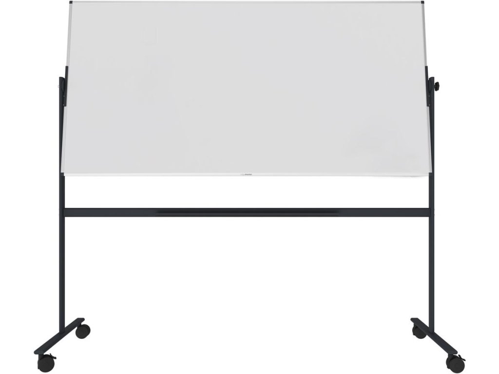 Základná rotačná tabuľa na príležitostné použitie v kancelárii, triede alebo v priemyselnom prostredí. Vhodná na písanie popisovačmi na tabuľu stierateľnými za sucha. Obojstranný, magnetický, lakovaný oceľový povrch dosky. Hliníkový rám so sivými plastovými rohovými krytkami. Upevnený na robustnom a mobilnom stojane s otočnou osou. Súčasťou balenia je odkladacia lišta. Rozmery v × š : 100 × 200 cm.