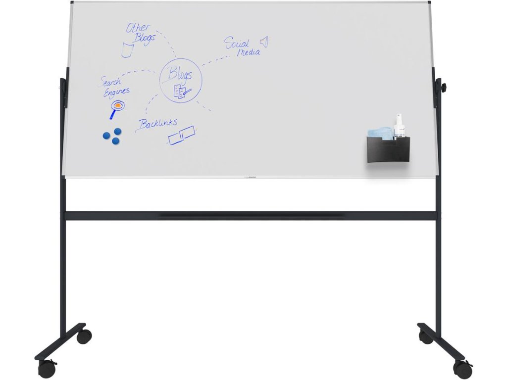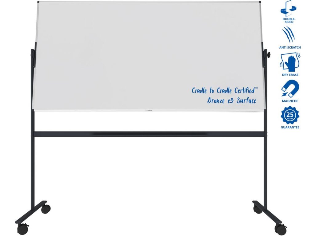 Magnetická tabuľa odolná voči poškriabaniu so smaltovaným oceľovým povrchom s použitím e3 Ceramic Steel, ktorá má certifikáciu Cradle to Cradle Certified™ na úrovni bronzu. Upevnená na robustnom a mobilnom stojane s otočnou osou 360° a 4 kolieskami (2 uzamykateľné). Súčasťou balenia je odkladacia lišta. Rozmery: 100 × 200 cm.