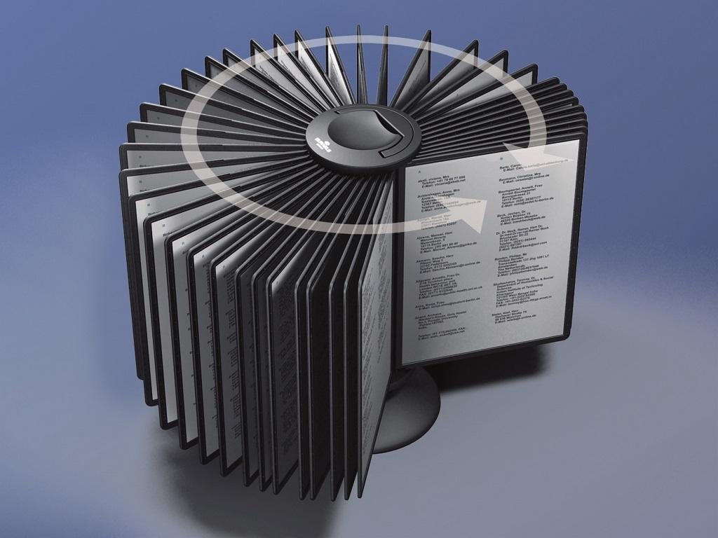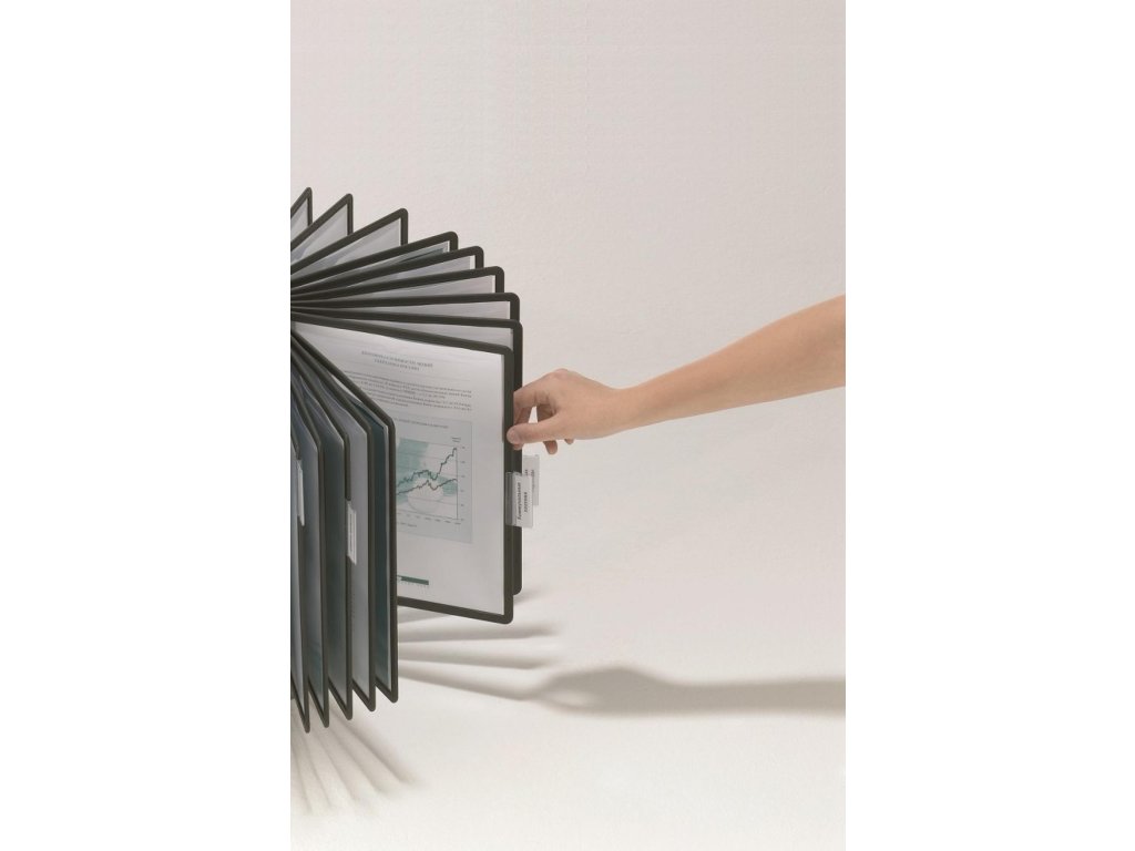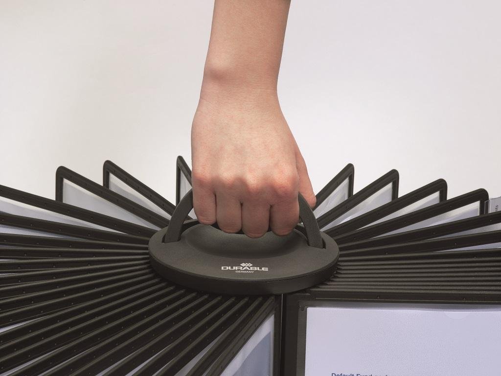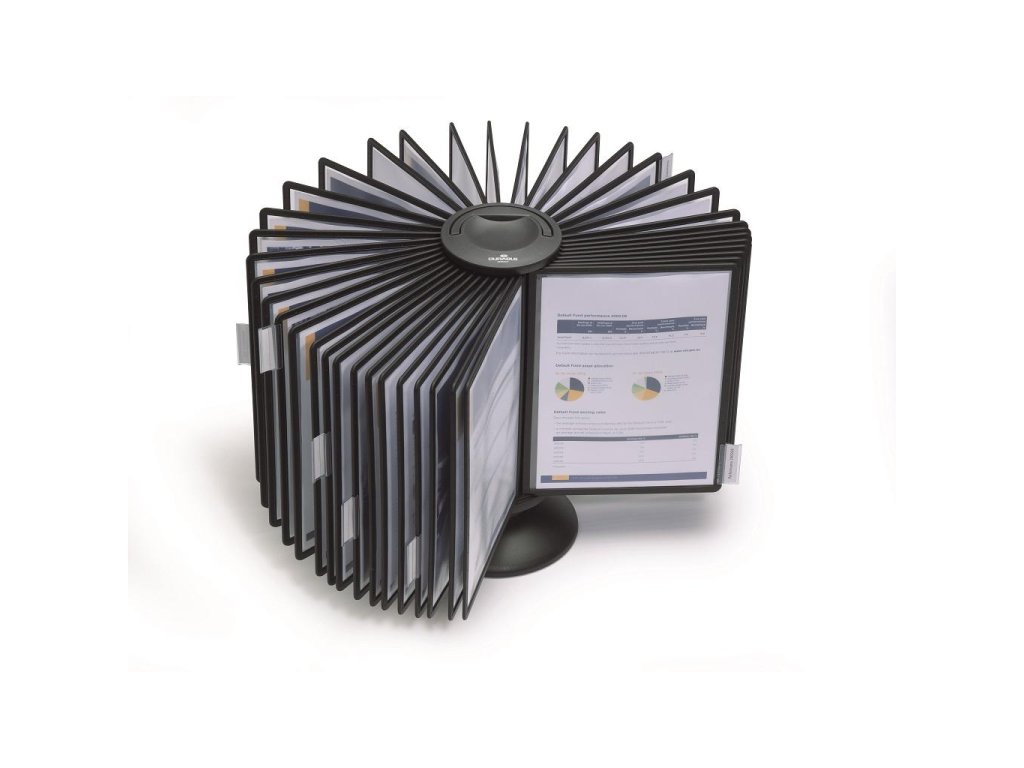 Rotačný stojan obsahuje 40 čiernych panelov A4 a 40 indexov. Ľahko prenosný vďaka madlu na vrchu stojana.