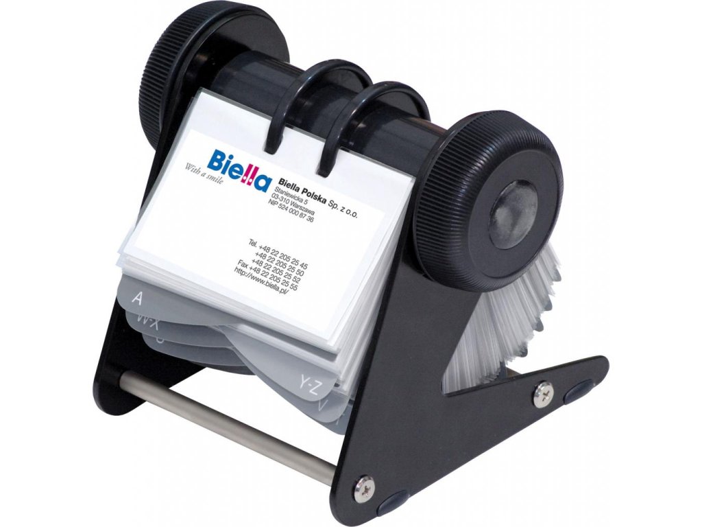 Praktický rotačný vizitkár s kovovou podstavou v čiernej farbe obsahuje 200 obojstranných vreciek rozmerov 103×66 mm na 400 vizitiek a abecedný rozraďovač s 2 oddielmi.