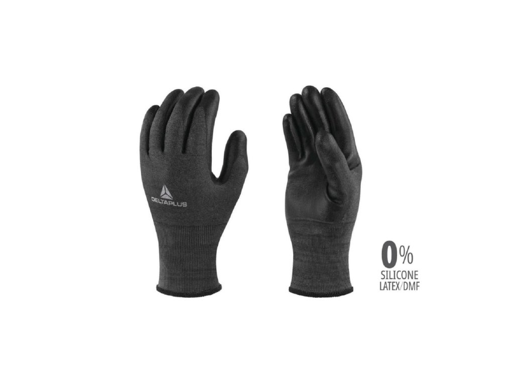 Pletené antistatické rukavice, materiál DELTAnocut® vysoko odolné vlákno a uhlíkové vlákno, dlaň a konce prstov povrstvené polyuretánom bez rozpúštadiel. Hrúbka úpletu 18.