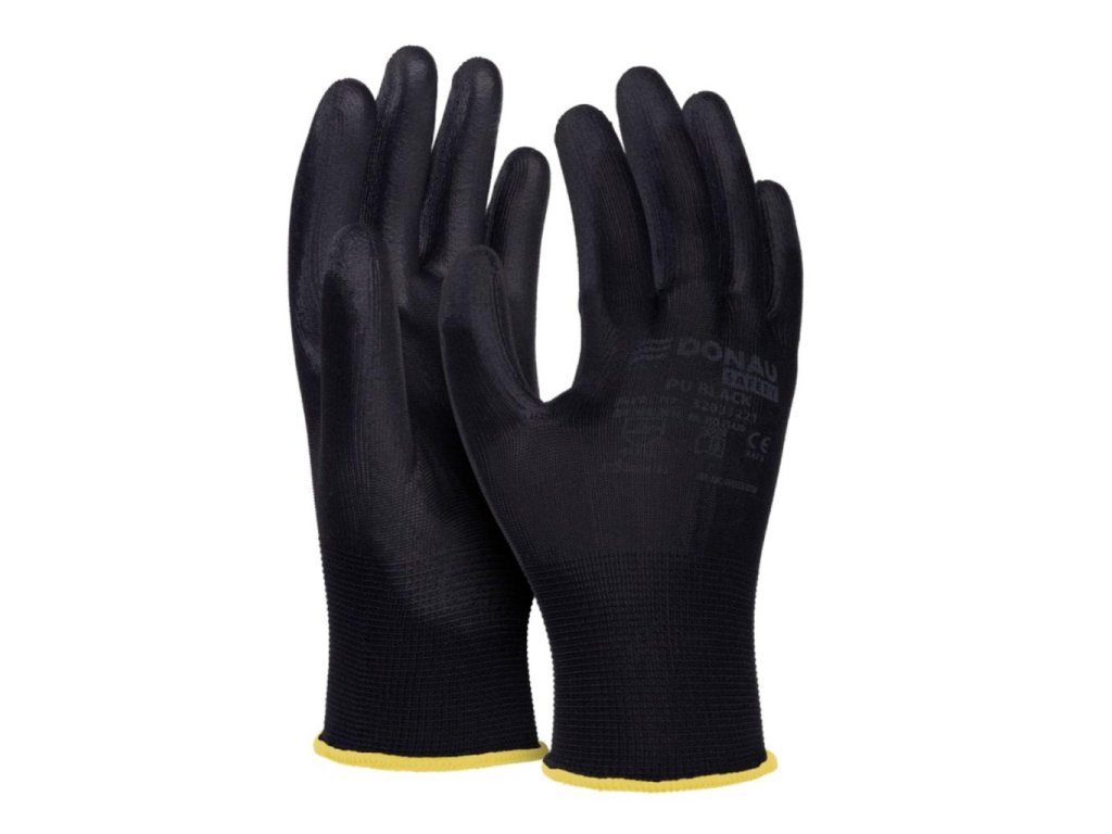 rukavice z kvalitného polyesterového úpletu čiernej farby, v oblasti úchopu potiahnuté čiernym polyuretánom