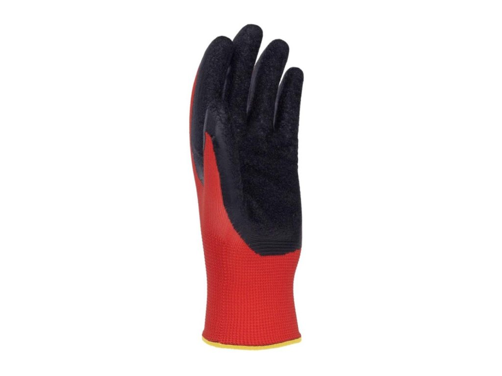 rukavice z kvalitnej pletenej polyesterovej tkaniny červenej farby, v úchopovej časti potiahnuté zdrsneným latexom čiernej farby