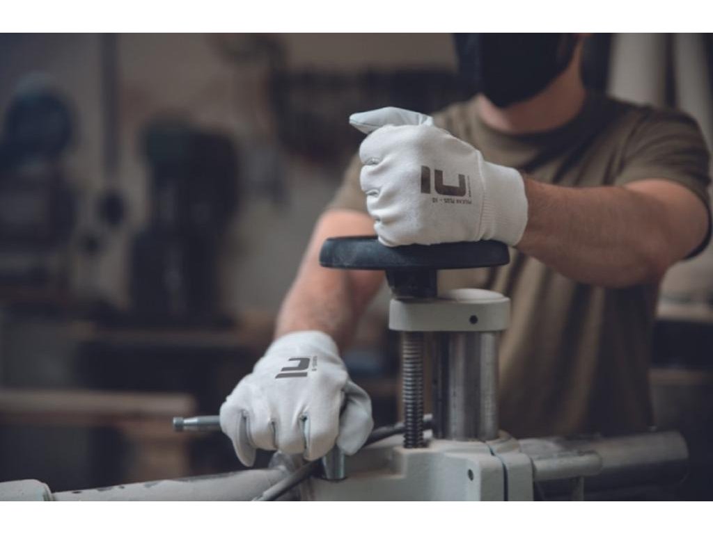 Rukavice šité z jemnej lícovej ovčiny v dlani, bielej bavlnenej tkaniny na chrbte a s nápletom.