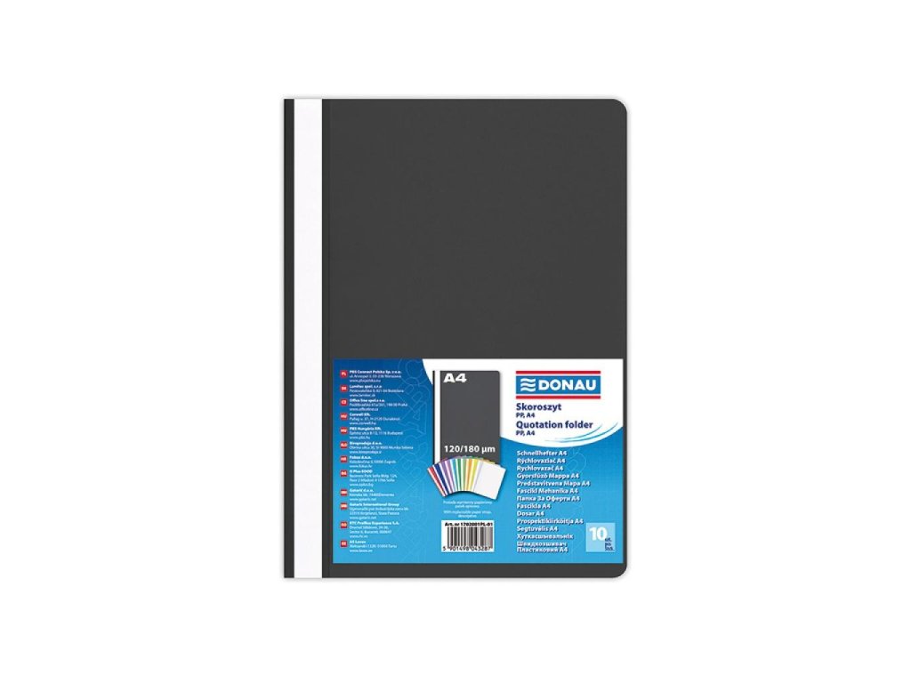 Štandardný polypropylénový rýchloviazač s priehľadnou prednou stranou a nasúvacím popisným pásikom. Formát A4. Balenie 10 ks.