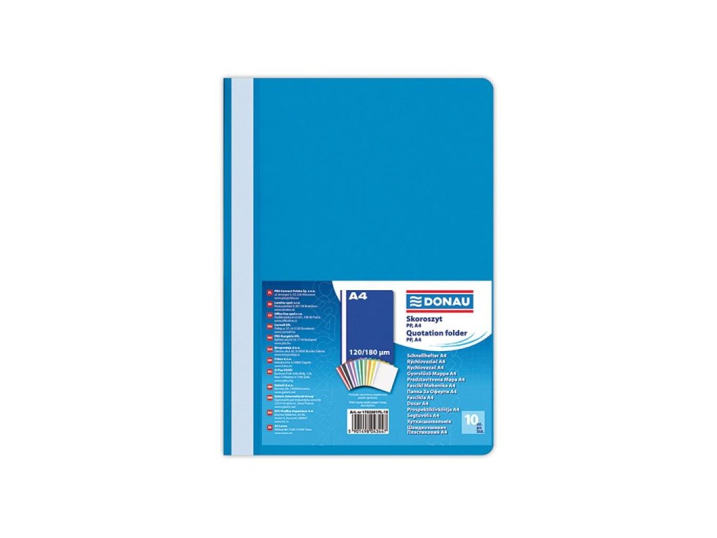 Štandardný polypropylénový rýchloviazač s priehľadnou prednou stranou a nasúvacím popisným pásikom. Formát A4. Balenie 10 ks.