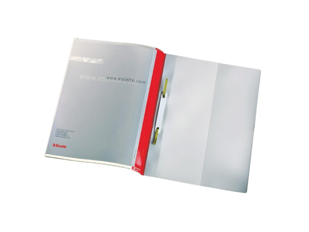 Obal s priehľadným predným a zadným vreckom na vloženie listu, vyrobený z kvalitného PVC. Slúži na uloženie dierovaných dokumentov o formátu A4. Biely papierový zasúvací štítok pozdĺž chrbta slúži na označenie obsahu. Rozmery 310 × 238 mm.V balení 25 ks.