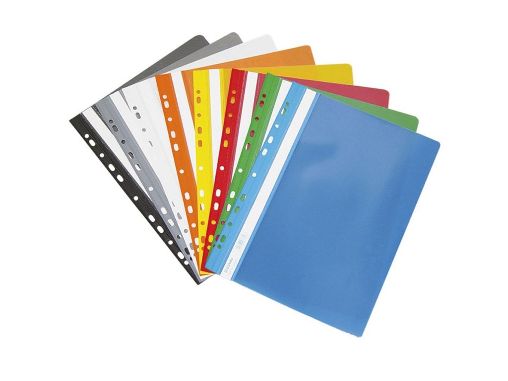 Obal s eurodierovaním z kvalitného polypropylénu na uloženie dierovaných dokumentov do formátu A4. Predná strana priehľadná lesklá, biely papierový zasúvací štítok pozdĺž chrbta. Rozmery 310 × 235 mm.