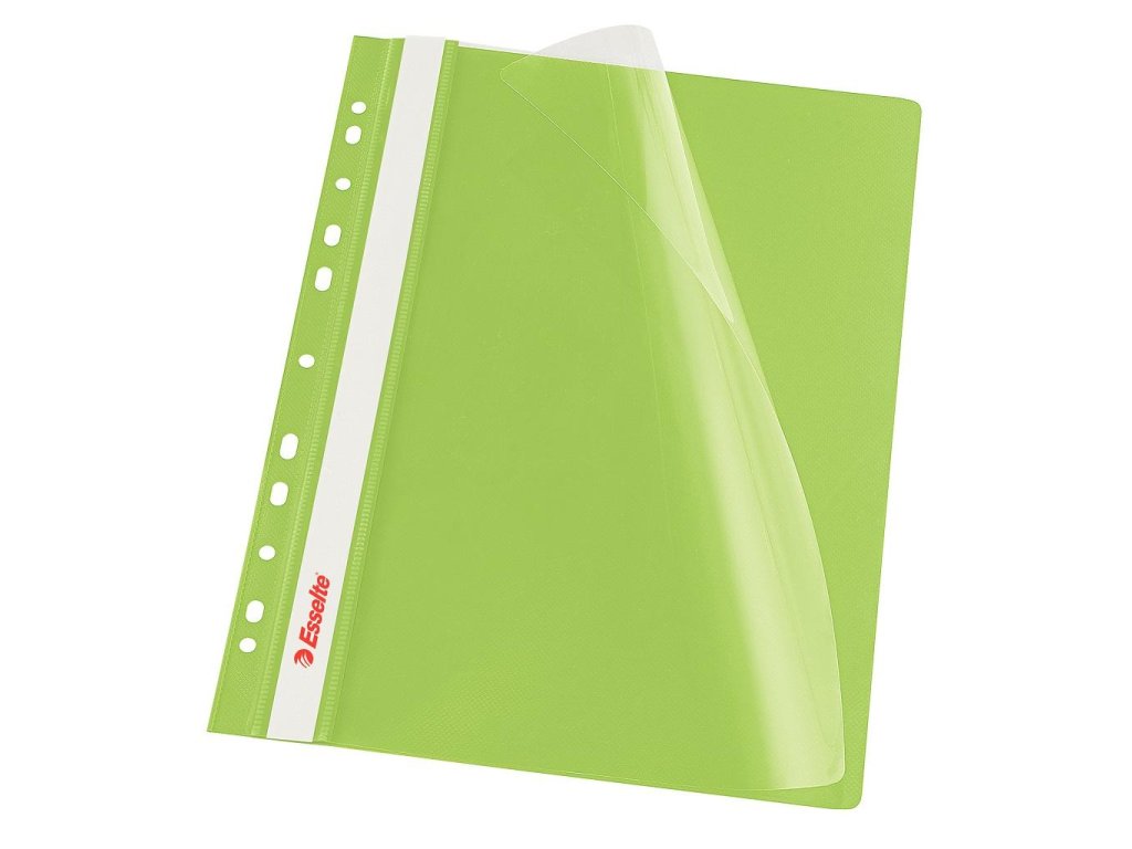 Obal s eurodierovaním z kvalitného PVC na uloženie dierovaných dokumentov do formátu A4. Predná strana priehľadná, pozdĺž chrbta biely obojstranný papierový zasúvací štítok. Rozmery 310 × 235 mm. Farba zelená.