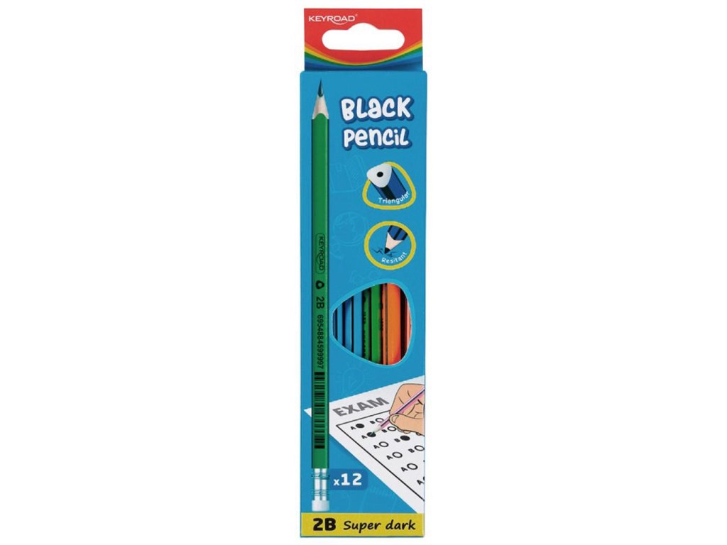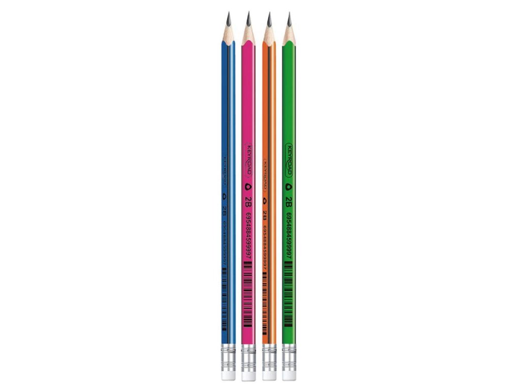Ceruzka vyrobená z dreva, s gumou, trojuholníkové telo. Tvrdosť: 2B. farba: mix farieb.