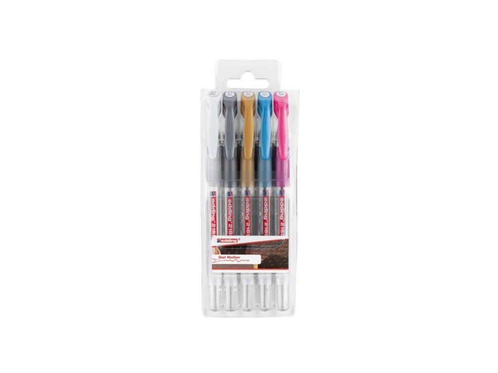 Jednorazový roller edding 2185 crystaljelly plnený špeciálnym gélom. Hrot pera uložený v akrylovej špičke umožňuje plynulé a súčasne veľmi presné písanie. Šírka stopy 0,7 mm. Sada 5ferieb biela, sivá, zlatá, tyrkysová, ružová.