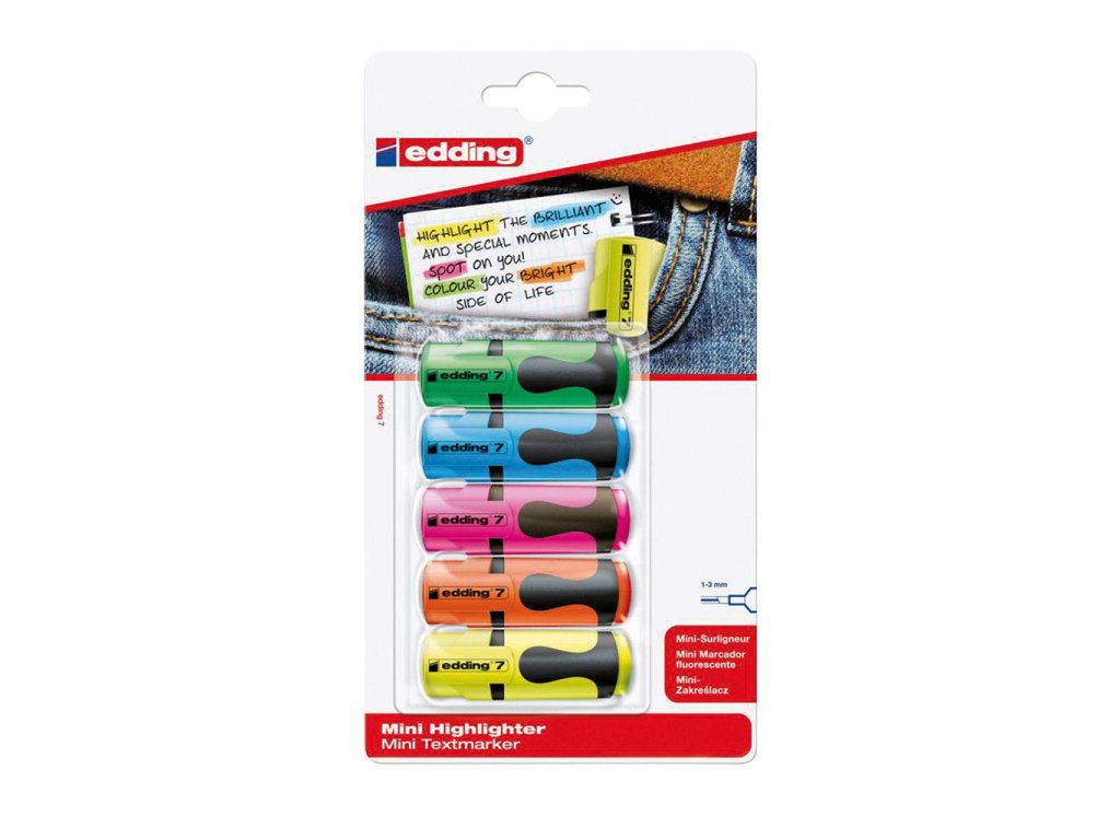5 kusová sada mini zvýrazňovačov edding so zrezaným hrotom so šírkou stopy 1 - 3 mm. Neónový pigment s maximálnym jasom, protišmyková ergonomická rukoväť. Uzáver s klipom.