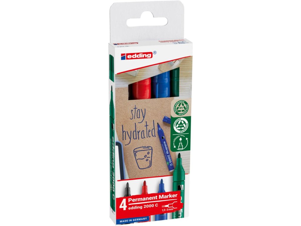 Sada 4 permanentných popisovačov na trvanlivé popisovanie, značenie, maľovanie a vyznačovanie takmer na všetky materiály vrátane kovu, skla a umelých hmôt. Hliníkový obal vo farbe popisovača, vymeniteľné špičky. Dopĺňateľné atramentom edding T 25 alebo MTK 25. Svetlostály, rýchloschnúci, nezmazateľný a vodeodolný atrament neobsahuje toluén/-xylén. Hrot okrúhly, šírka stopy 1,5-3 mm.