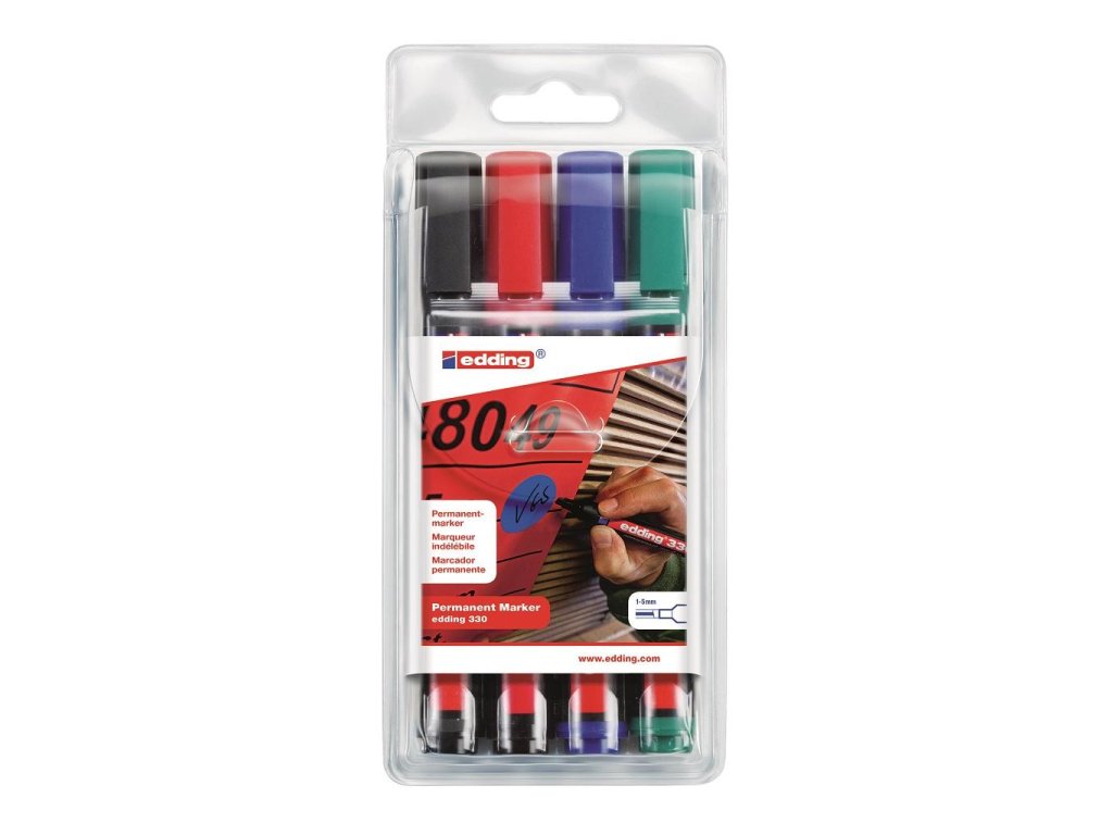 Permanentný popisovač vhodný na trvanlivé popisovanie, značenie, maľovanie a vyznačovanie takmer na všetky materiály vrátane kovu, skla a umelých hmôt. Plastový obal. Zrezaný hrot, šírka stopy 1,5 - 3 mm. Dopĺňateľný atramentom edding MTK 25 obj. kód ED250001 -4. Sada 4 ks v mixe farieb.
