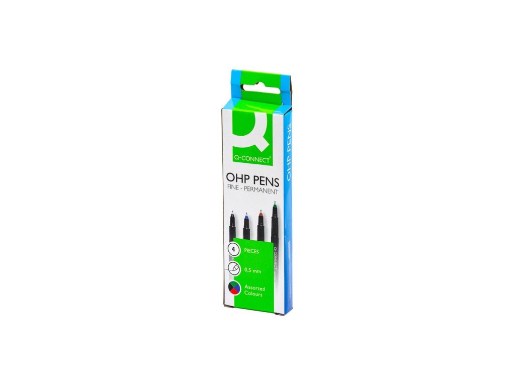 Permanentný popisovač Q-Connect OHP, rýchloschnúci. Jemný plastový hrot s 0,5 mm šírkou písma permanentným atramentom. Sada 4 farieb.