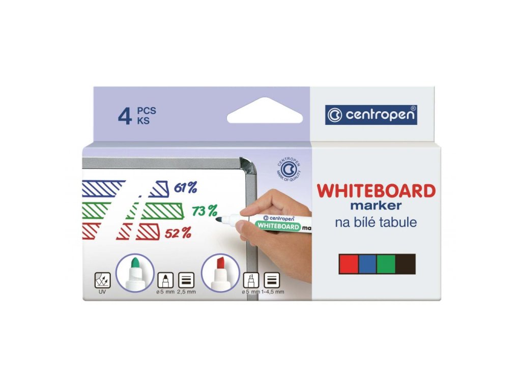 Za sucha stierateľné svetlostále popisovače na alkoholovej báze, vhodné na biele smaltované tabule a na neporézne povrchy. Zdravotne nezávadné. Skladujte vo vodorovnej polohe. Hrot zrezaný, šírka stopy 1 - 4,5 mm.
