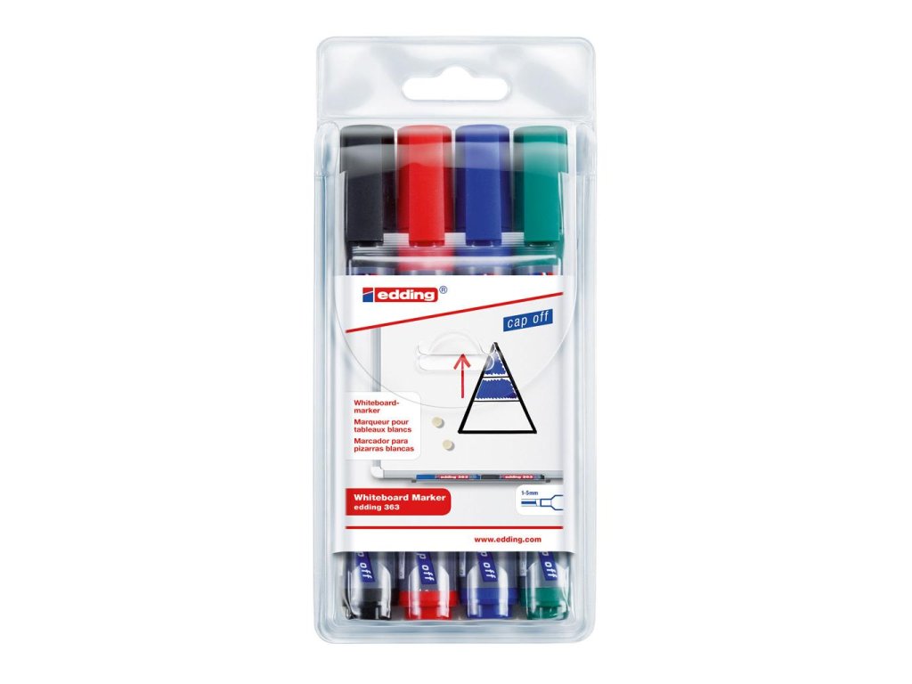 Popisovač na biele tabule s plastovým telom a vymeniteľným hrotom. Dopĺňateľný atramentom edding BTK 25. Hrot zrezaný, šírka stopy 1---5 mm. Sada 4 ks.