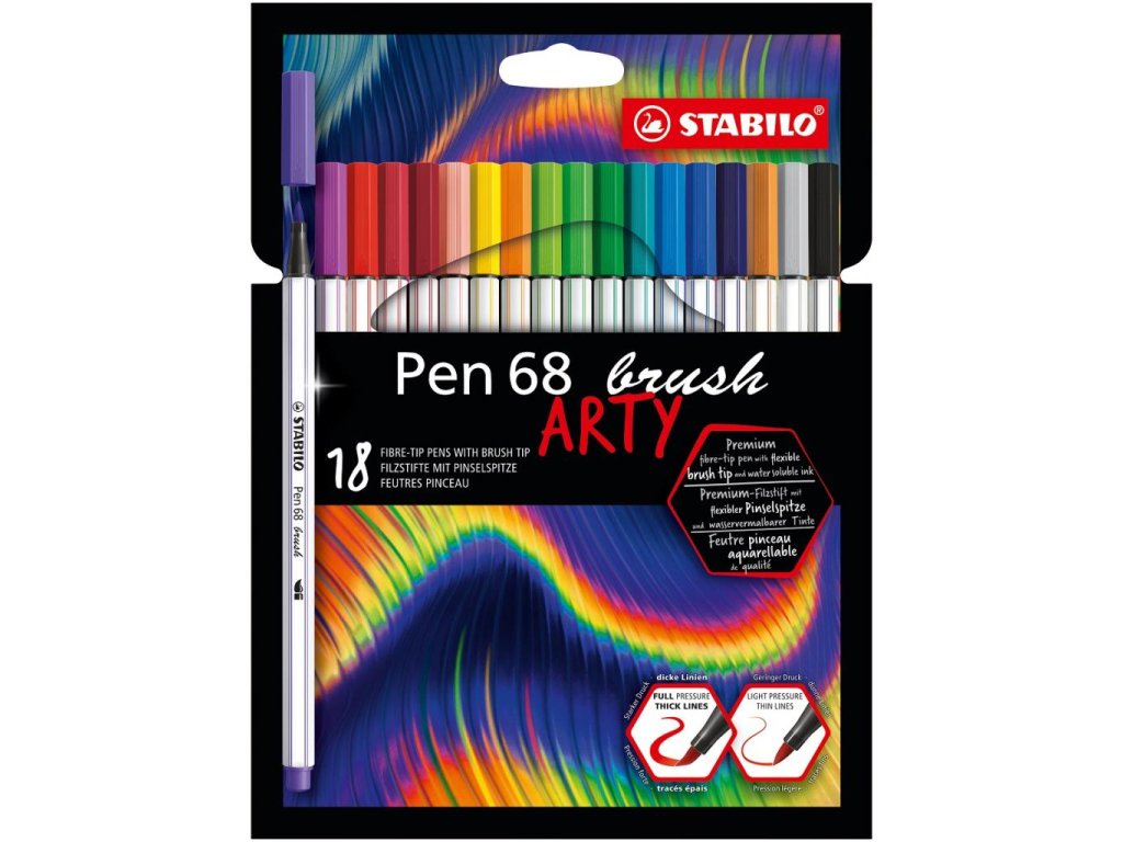 So STABILO Pen 68 brush dokonale ovládnete svoje ťahy fixkou, takže môžete ľahko nakresliť krásne línie a vytvoriť skvelé texty v štýle letteringu, ktoré sú teraz fascinujúcim trendom.S novým flexibilným hrotom je táto fixka ďalším prírastkom do rodiny Pen 68 brush, ktorý je vhodný pre začiatočníkov i pokročilých umelcov. Reguláciou tlaku na špičku fixy môžete pomocou `štetcového` hrotu vytvoriť silné alebo tenké línie - v 24 populárnych odtieňoch, vrátane 5 neónových farieb. Vďaka náplni na vodnej báze môžete docieliť ďalšie skvelé efekty: napríklad tieňovanie, miešanie jednotlivých odtieňov alebo použiť fixku ako akvarel.Rozmanité využitie dodá Vašim do-it-yourself projektom a vlastnému designu celkom nový rozmer. Brilantné a zaujímavé kresby sa vyznačujú sýtymi farbami na ktoré budete pyšní! V spoločnosti STABILO spoliehame na viac ako 50 rokov skúseností. Balenie 18 kusov. Farba mix.