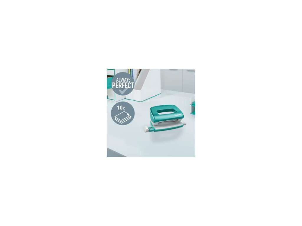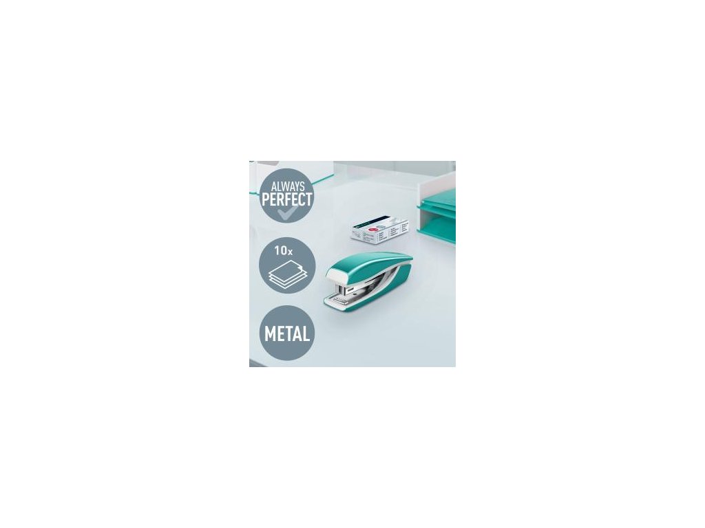 Minisúprava v moderných farbách. Malé a kompaktné rozmery. Kapacita 10 hárkov. Celokovová minizošívačka a dierovačka na použitie v kancelárii aj na cestách. Zošívačka s otvorením ramena o 180° na nástenkové zošívanie. Použite spinky Leitz Power Performance P2, č. 10, jedna škatuľka spiniek je súčasťou balenia. Dierovačka má príložník s kontrastnou potlačou jednotlivých formátov, rámček na jasné určenie formátu. Balenie v blistri. Farba modrá.
