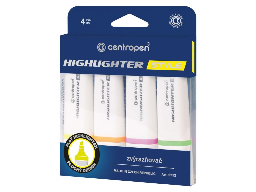 Zvýrazňovač v modernom dizajne pre hladké a pohodlné zvýraznenie textu s klinovým hrotom so šírkou stopy 1 - 4,6 mm. Plnený fl uorescenčným atramentom, vhodným na všetky druhy papierov. Väčšie balenie 10 ks v jednej farbe. Farba mix.