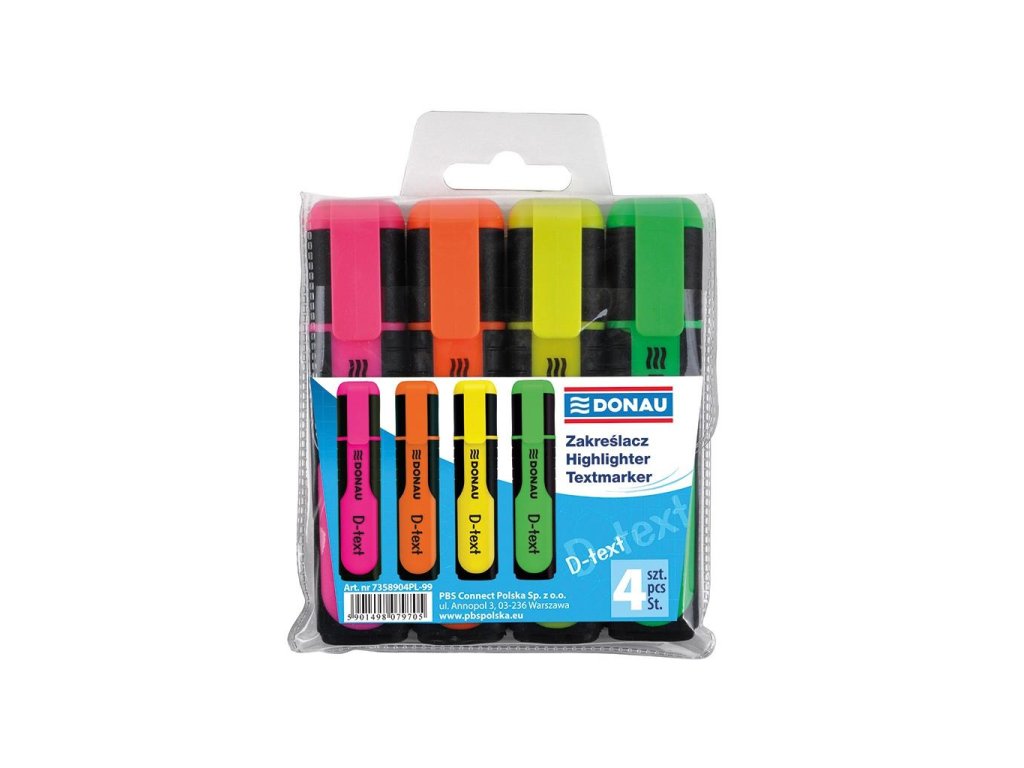 Sada 4 zvýrazňovačov so zrezaným hrotom na vyznačovanie textu. Šírka stopy 1-5 mm, dĺžka stopy 200 m.