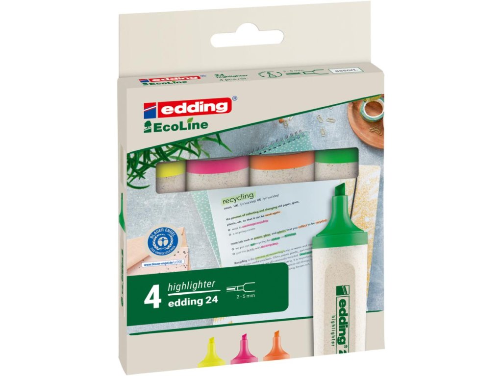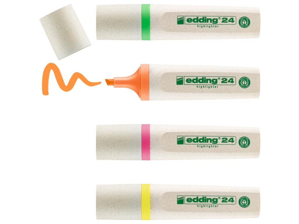 Minimálne 90% tela a uzáveru zvýrazňovača je vyrobené z obnoviteľných zdrojov. Zvýrazňovač so zrezaným hrotom so šírkou stopy 2 - 5 mm. Pre zvýraznenie textových pasáží, poznámok a pod. Atrament na vodnej báze s intenzívnymi farbami. Dopĺňateľný atramentom HTK 25.