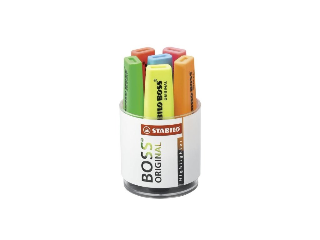 Sada zvýrazňovačov STABILO BOSS ORIGINAL 6 ks sklenná dóza žltá, zelená, oranžová, červená, ružová, modrá