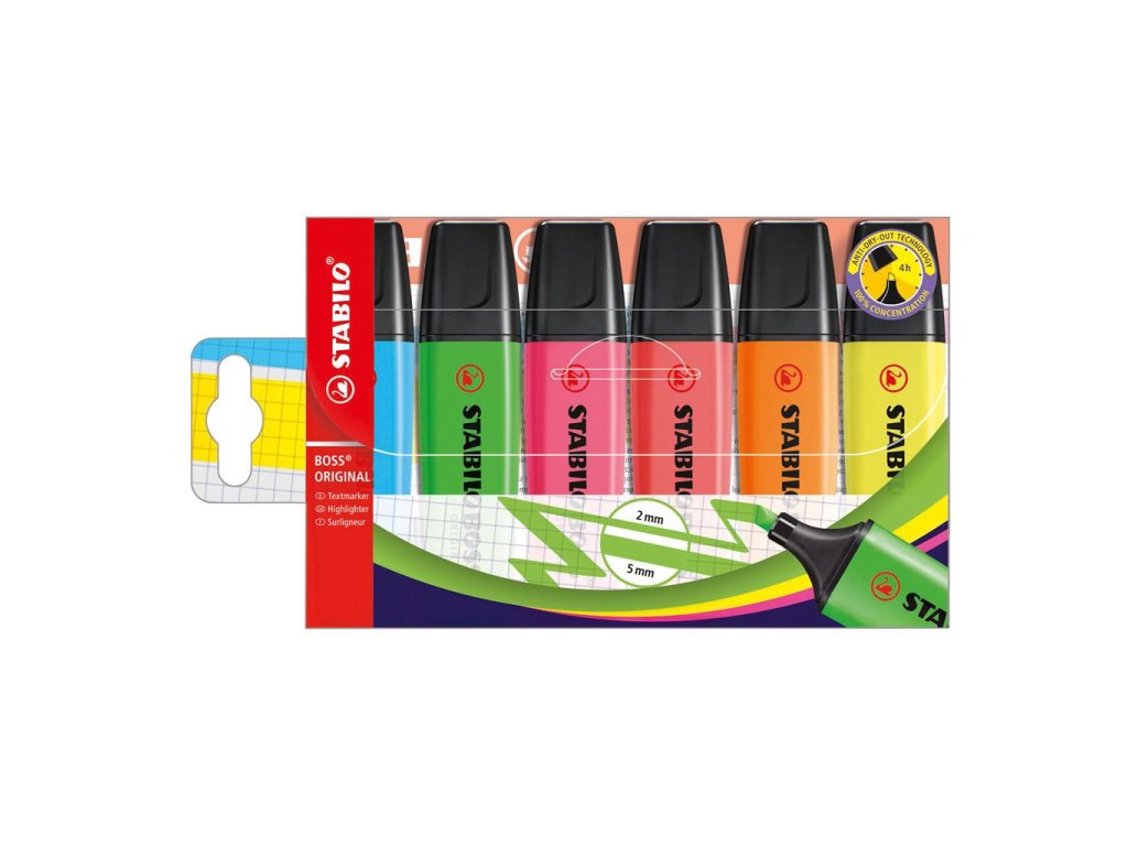 Sada 6 zvýrazňovačov s vysokým výkonom písania a dlhou životnosťou. Univerzálny atrament na vodnej báze, mäkký hrot.
