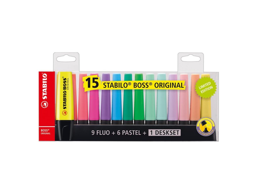 Sada 15 zvýrazňovačov s vysokým výkonom písania a dlhou životnosťou. Univerzálny atrament na vodnej báze, mäkký hrot.