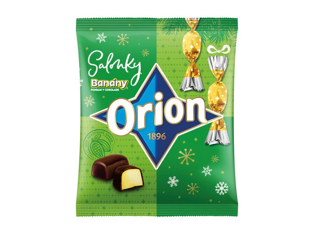 Fondánová cukrovinka s banánovou chuťou máčaná v horkej čokoláde. Oslaďte si Vianoce lahodnou horkou čokoládou s náplňou s chuťou banánov.